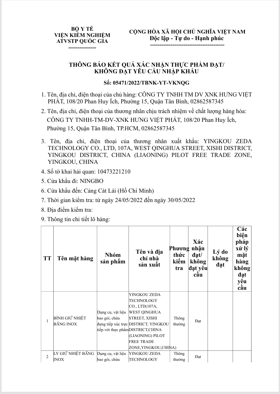 Tất cả sản phẩm bình giữ nhiệt Inox đều được nhập khẩu chính ngạch, có xuất xứ hàng hóa rõ ràng và được kiểm nghiệm an toàn bởi Bộ Y tế – Viện Kiểm nghiệm An toàn Vệ sinh Thực phẩm Quốc gia.