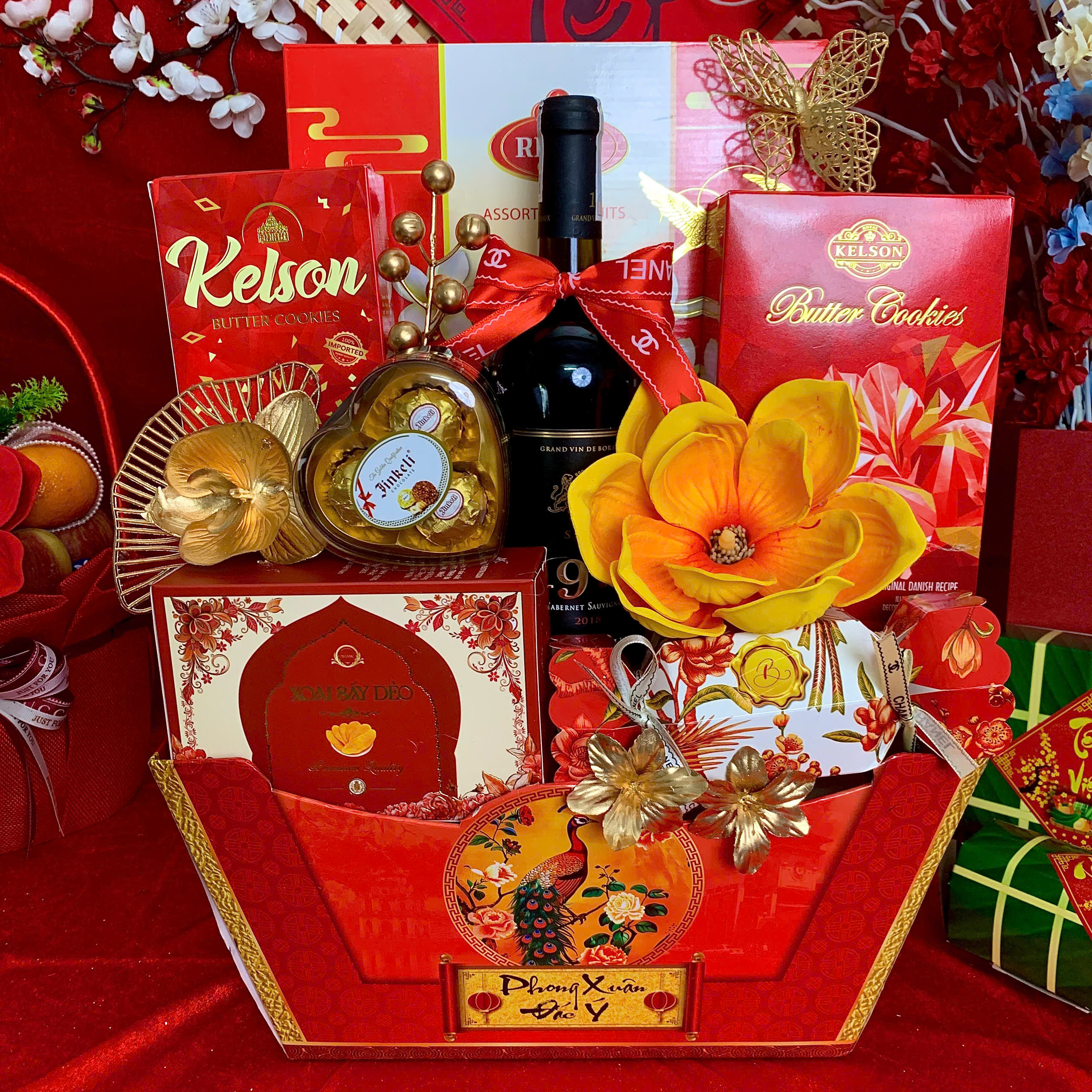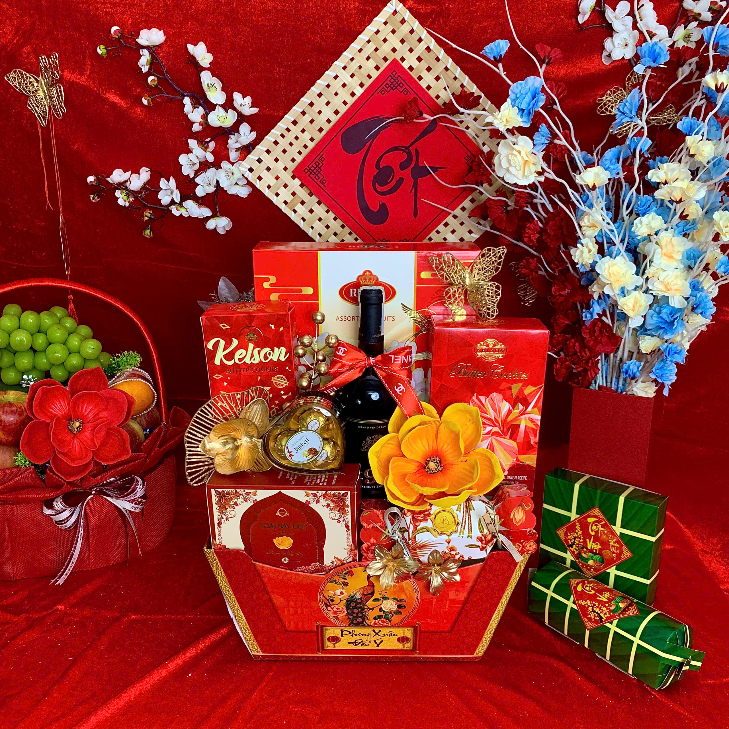 - Thiết kế sang trọng: Giỏ quà phối tông đỏ – vàng – xanh dương, tượng trưng cho may mắn, tài lộc và thịnh vượng.