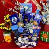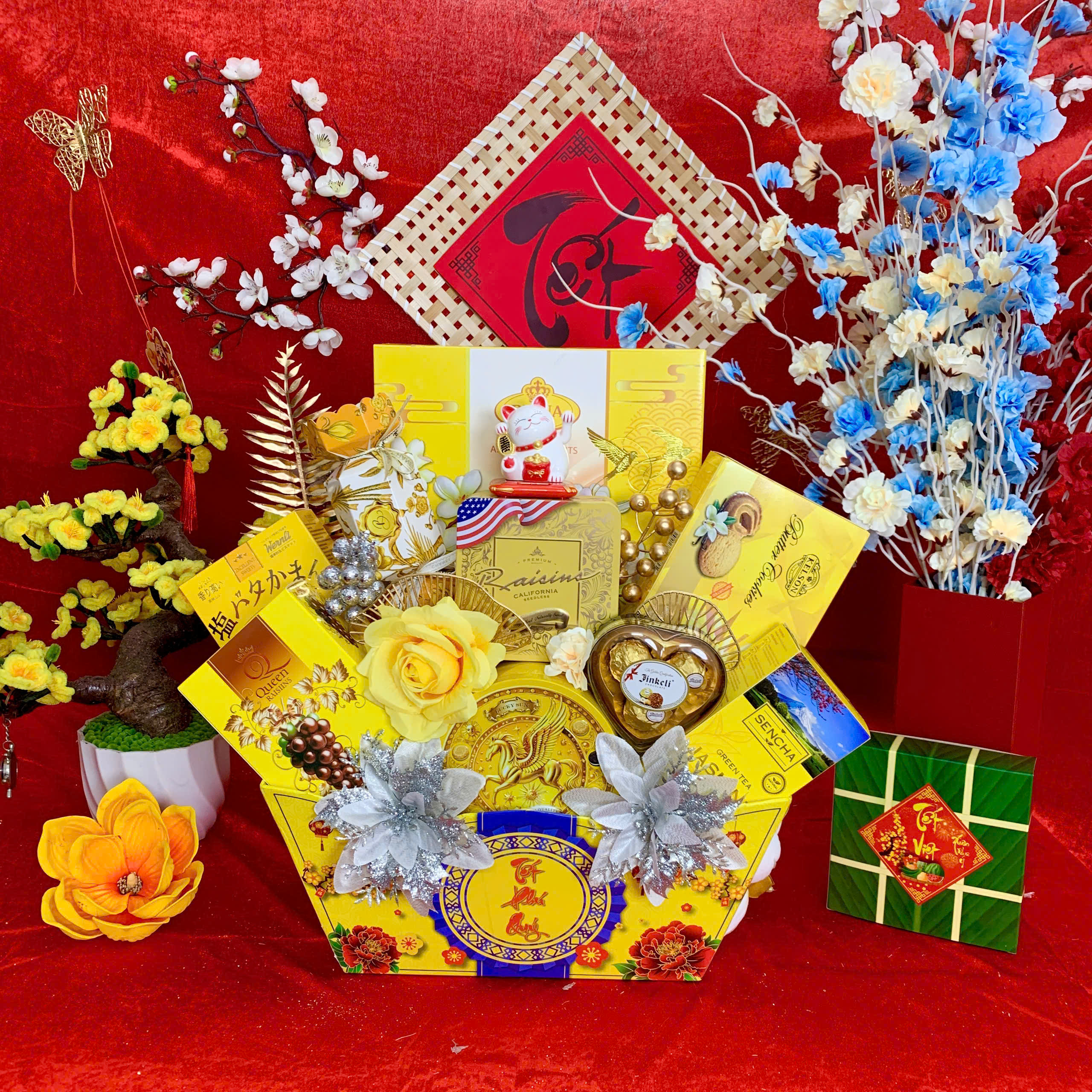 - Thiết kế sang trọng: Giỏ quà phối tông đỏ – vàng – xanh dương, tượng trưng cho may mắn, tài lộc và thịnh vượng.