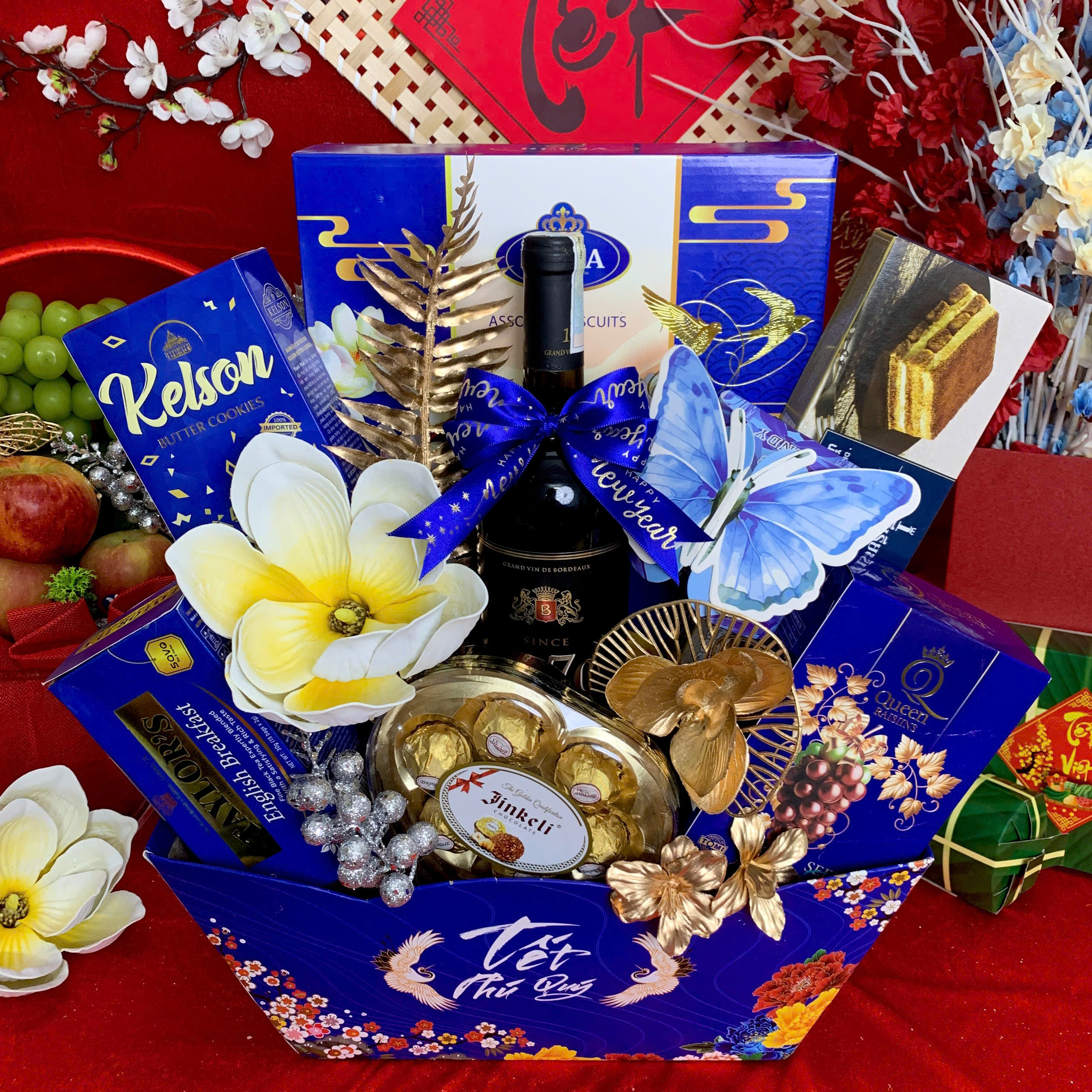 - Thiết kế sang trọng: Giỏ quà phối tông đỏ – vàng – xanh dương, tượng trưng cho may mắn, tài lộc và thịnh vượng.