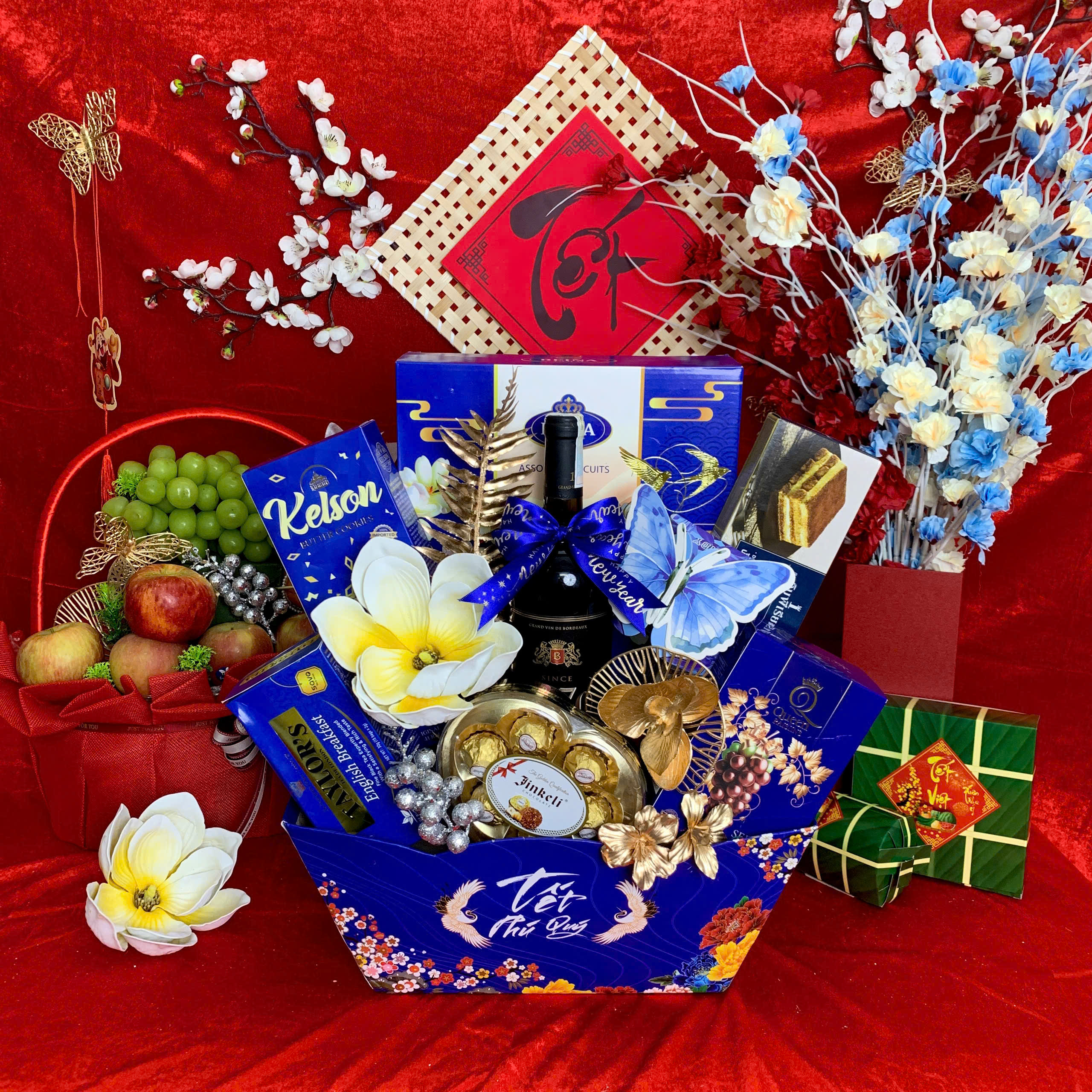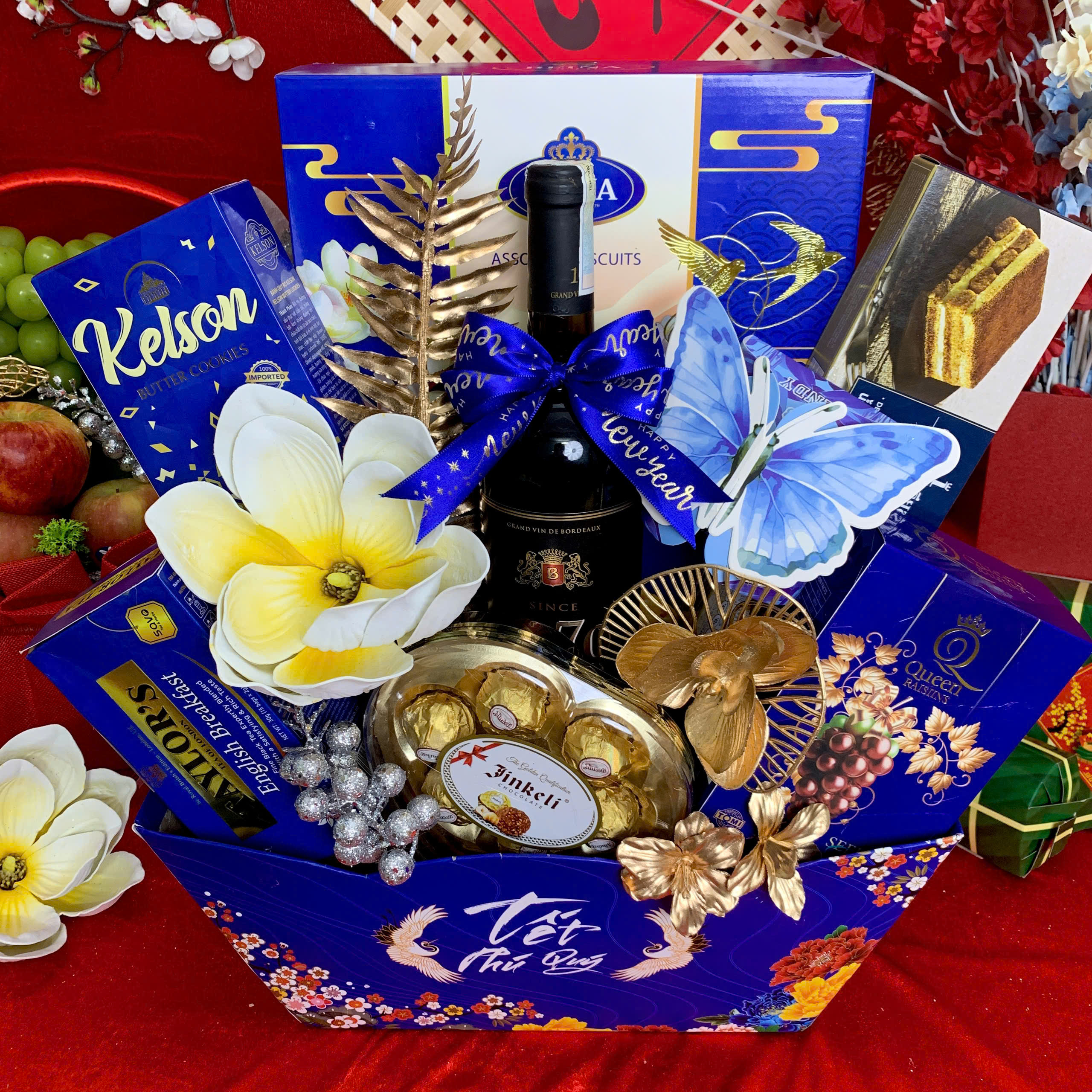 - Thiết kế sang trọng: Giỏ quà phối tông đỏ – vàng – xanh dương, tượng trưng cho may mắn, tài lộc và thịnh vượng.