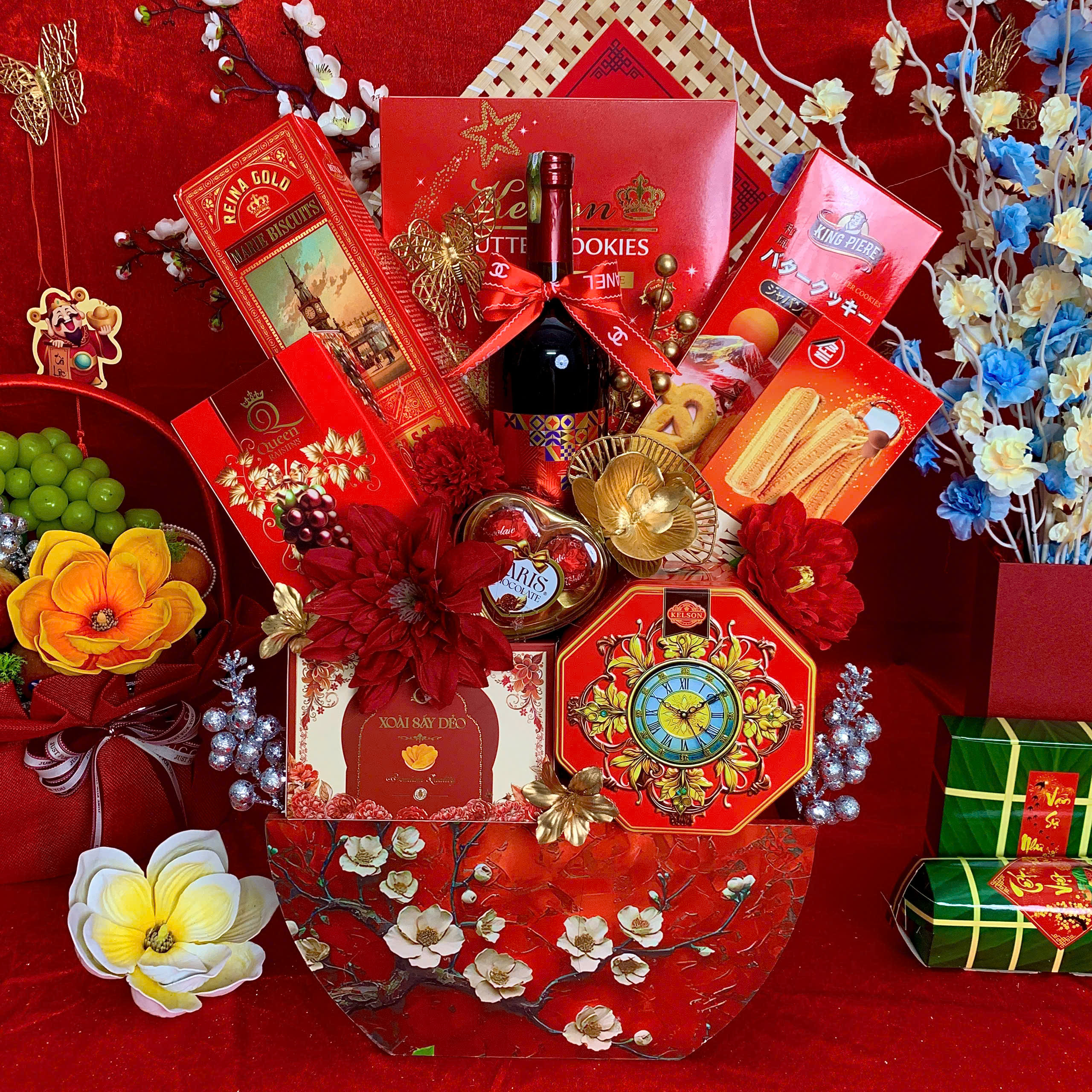 - Thiết kế sang trọng: Giỏ quà phối tông đỏ – vàng – xanh dương, tượng trưng cho may mắn, tài lộc và thịnh vượng.