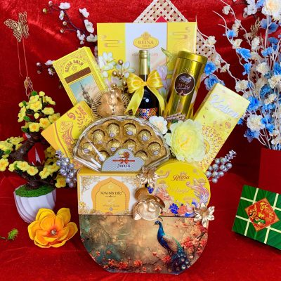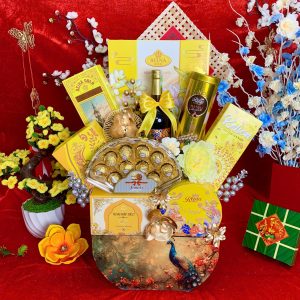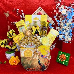 - Thiết kế sang trọng: Giỏ quà phối tông đỏ – vàng – xanh dương, tượng trưng cho may mắn, tài lộc và thịnh vượng.