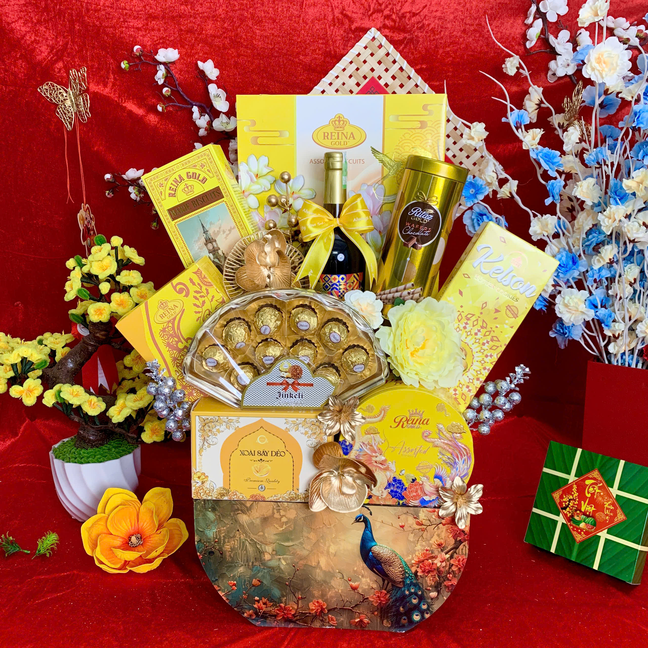 - Thiết kế sang trọng: Giỏ quà phối tông đỏ – vàng – xanh dương, tượng trưng cho may mắn, tài lộc và thịnh vượng.