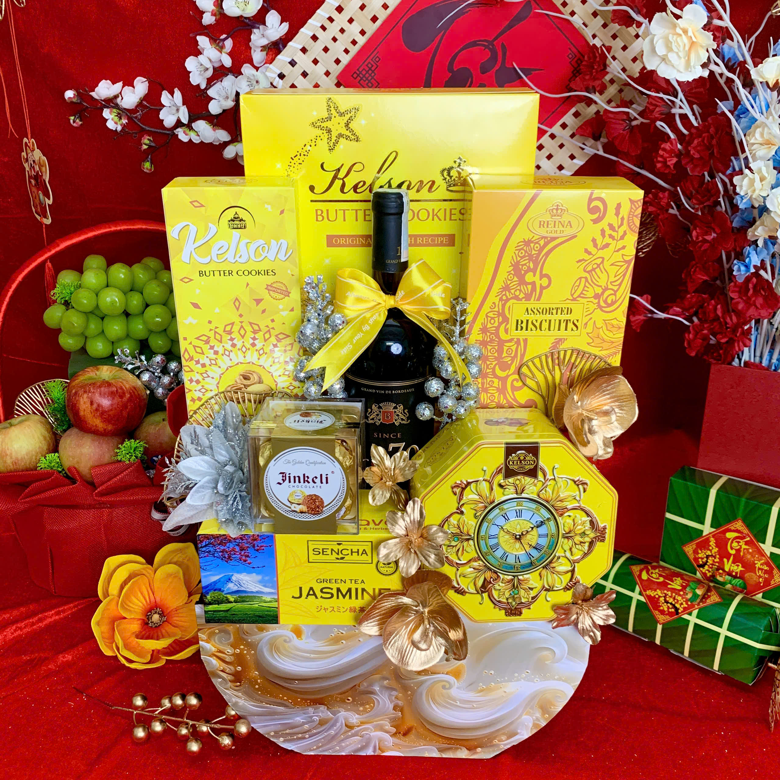 - Thiết kế sang trọng: Giỏ quà phối tông đỏ – vàng – xanh dương, tượng trưng cho may mắn, tài lộc và thịnh vượng.