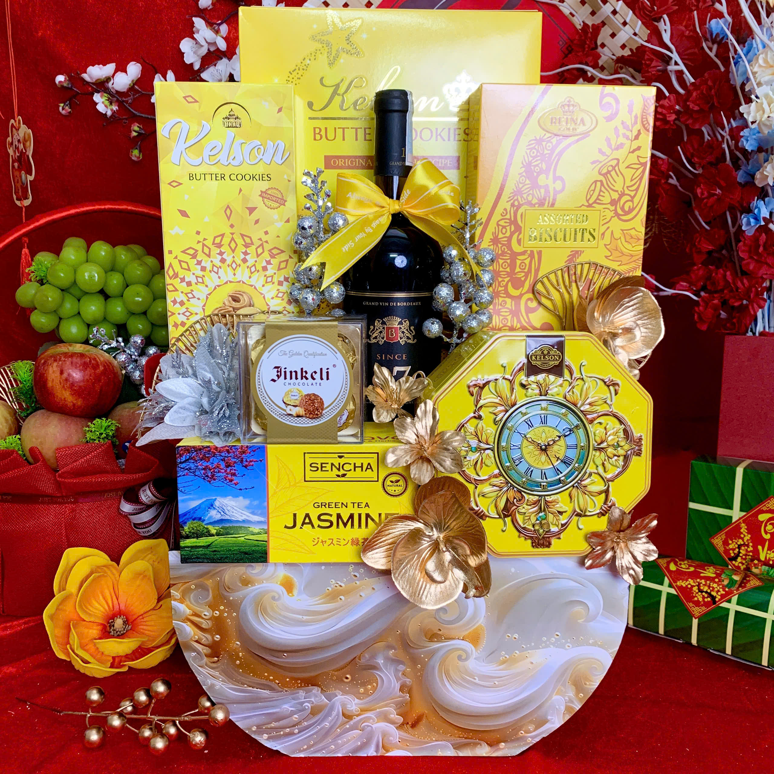 - Thiết kế sang trọng: Giỏ quà phối tông đỏ – vàng – xanh dương, tượng trưng cho may mắn, tài lộc và thịnh vượng.