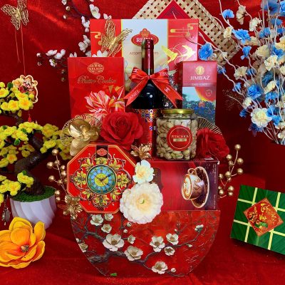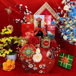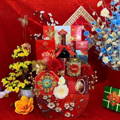 - Thiết kế sang trọng: Giỏ quà phối tông đỏ – vàng – xanh dương, tượng trưng cho may mắn, tài lộc và thịnh vượng.