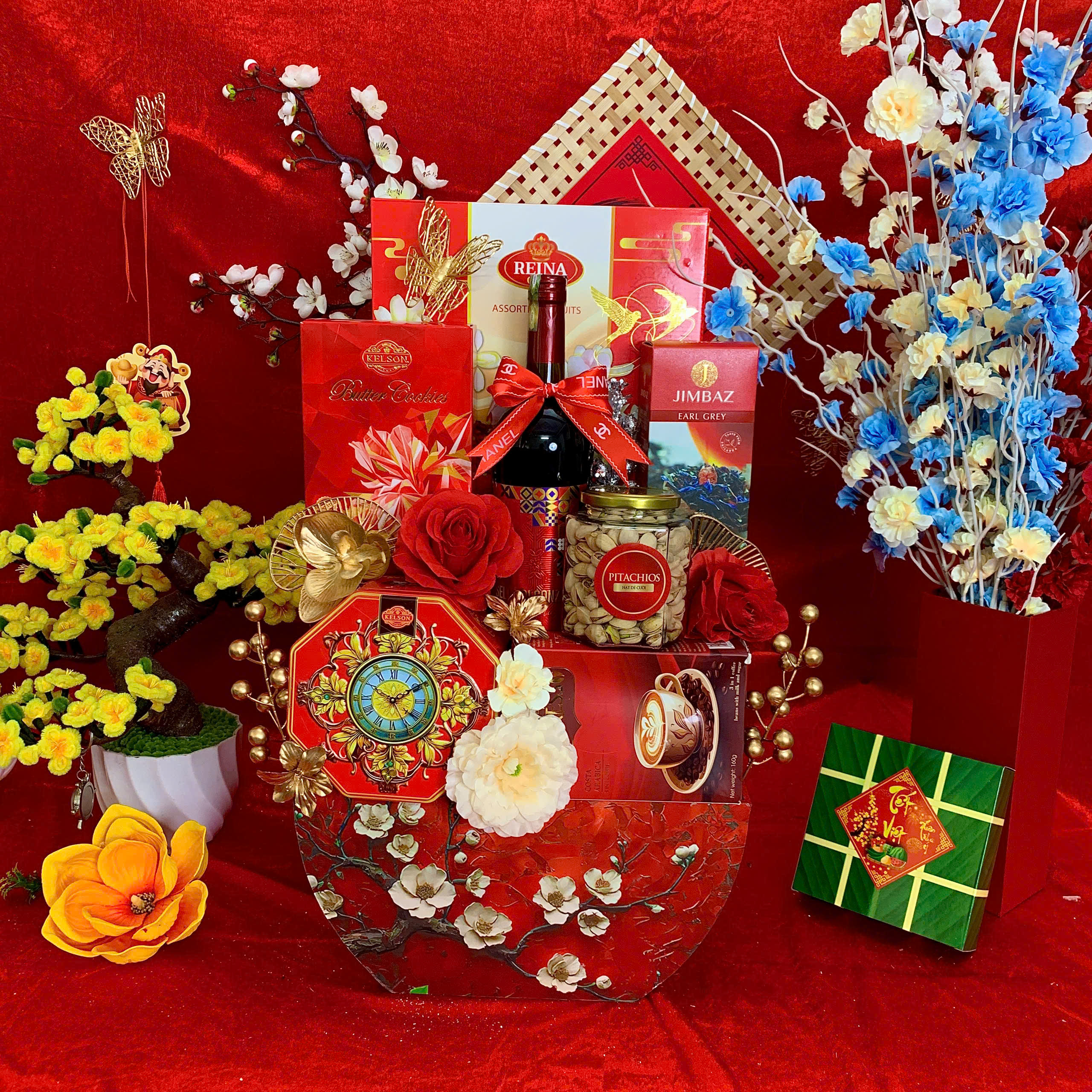 - Thiết kế sang trọng: Giỏ quà phối tông đỏ – vàng – xanh dương, tượng trưng cho may mắn, tài lộc và thịnh vượng.
