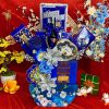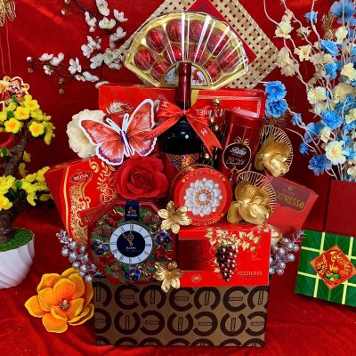 - Thiết kế sang trọng: Giỏ quà phối tông đỏ – vàng – xanh dương, tượng trưng cho may mắn, tài lộc và thịnh vượng.