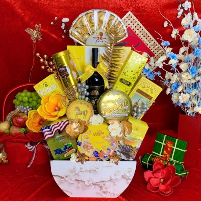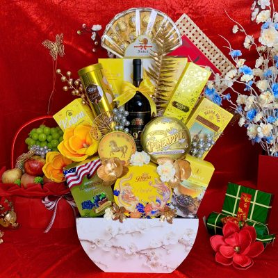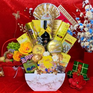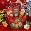 - Thiết kế sang trọng: Giỏ quà phối tông đỏ – vàng – xanh dương, tượng trưng cho may mắn, tài lộc và thịnh vượng.