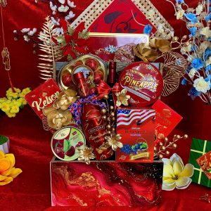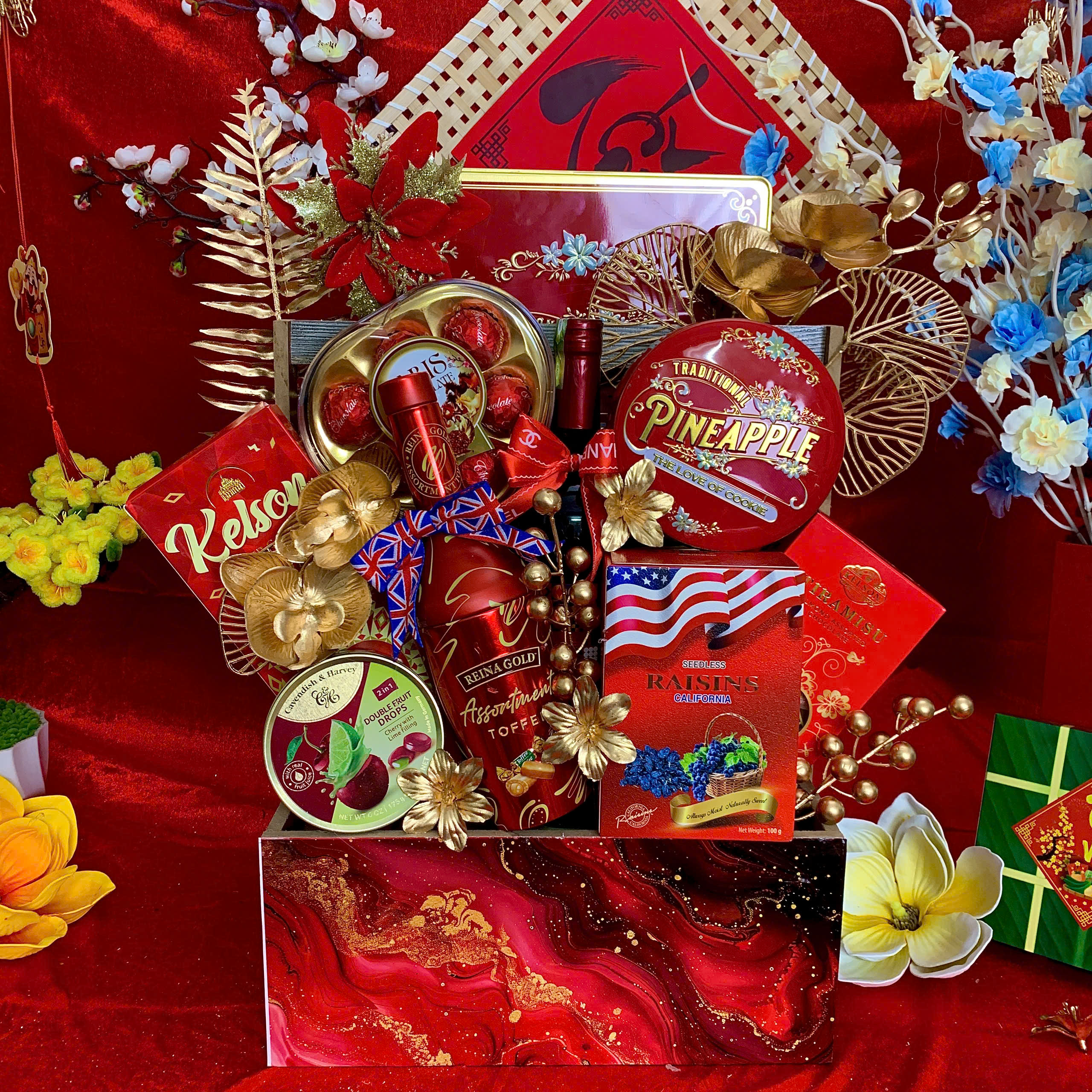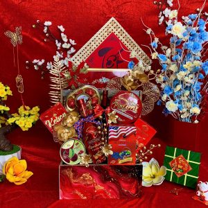 - Thiết kế sang trọng: Giỏ quà phối tông đỏ – vàng – xanh dương, tượng trưng cho may mắn, tài lộc và thịnh vượng.