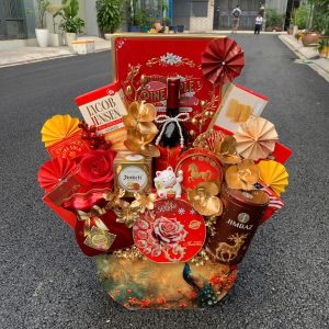 - Thiết kế sang trọng: Giỏ quà phối tông đỏ – vàng – xanh dương, tượng trưng cho may mắn, tài lộc và thịnh vượng.