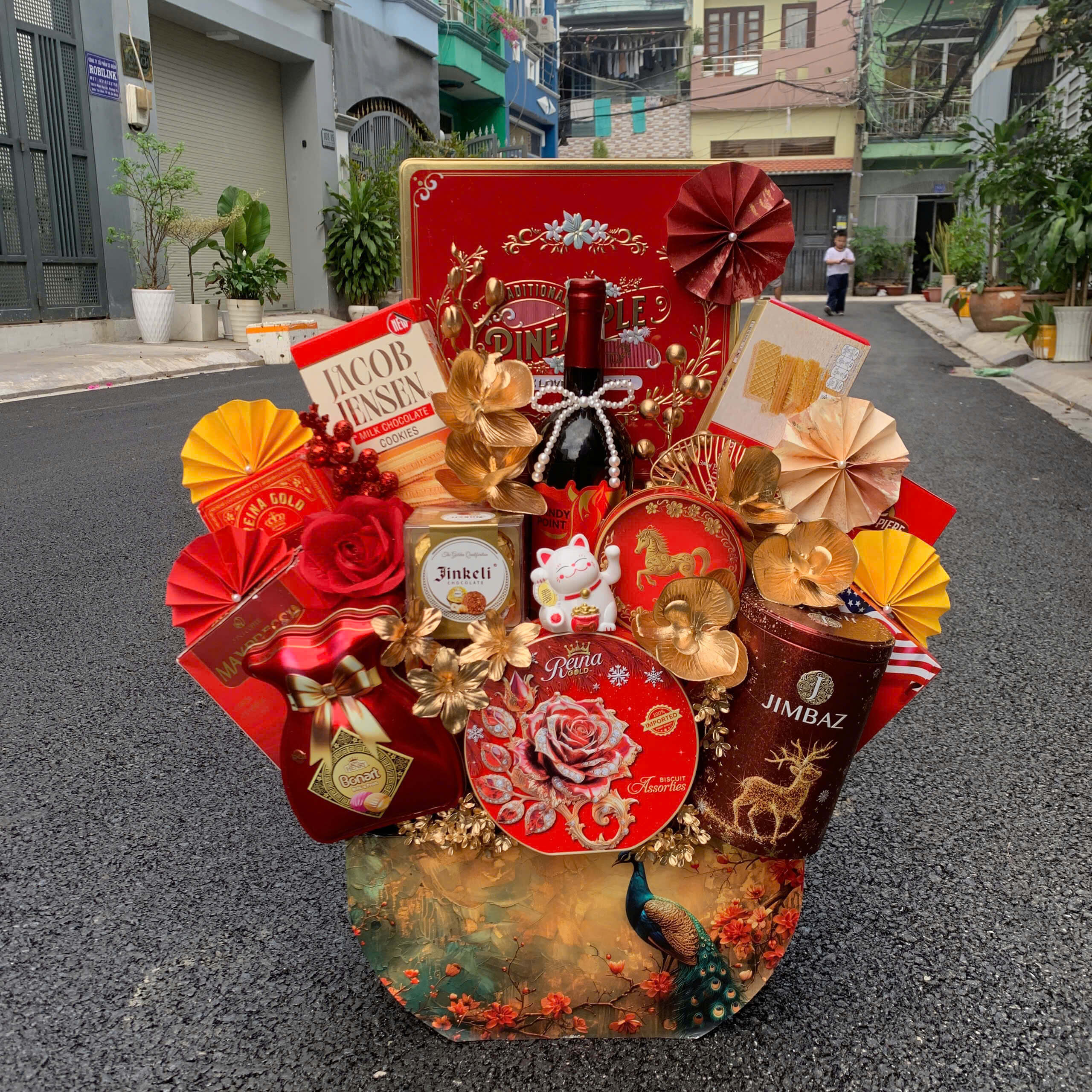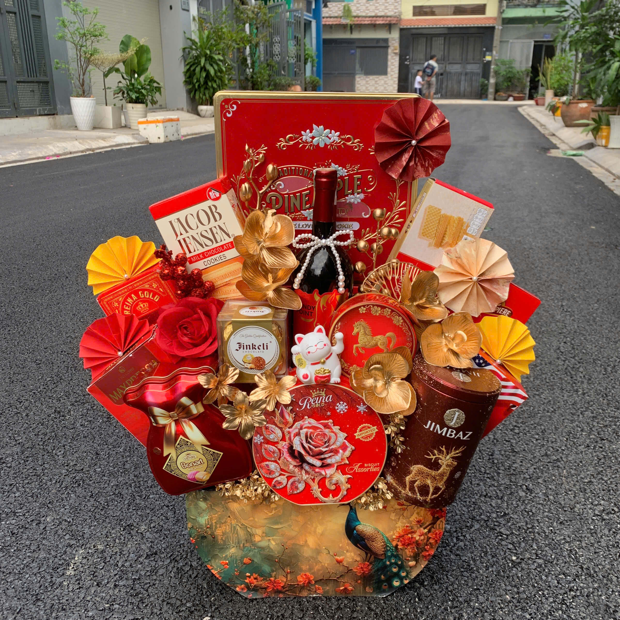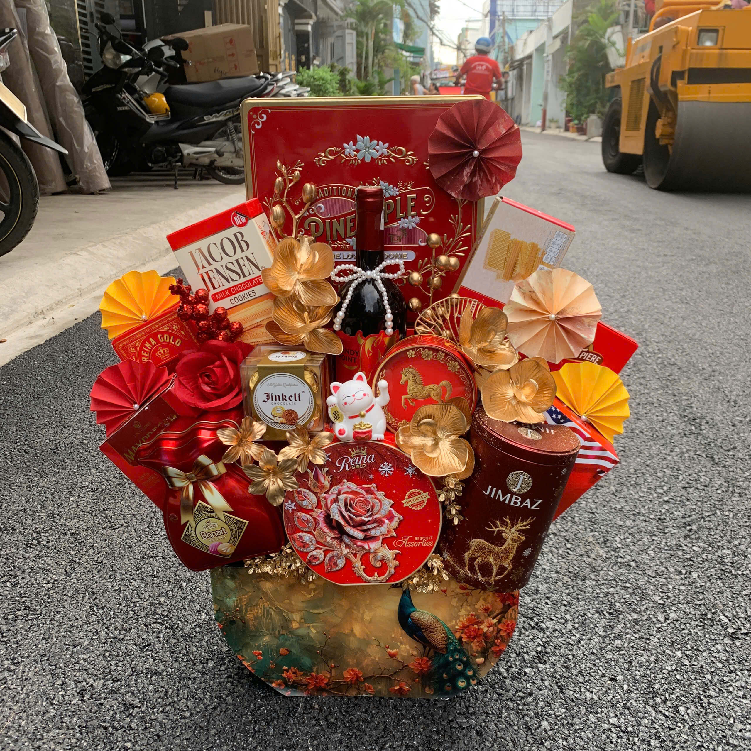 - Thiết kế sang trọng: Giỏ quà phối tông đỏ – vàng – xanh dương, tượng trưng cho may mắn, tài lộc và thịnh vượng.