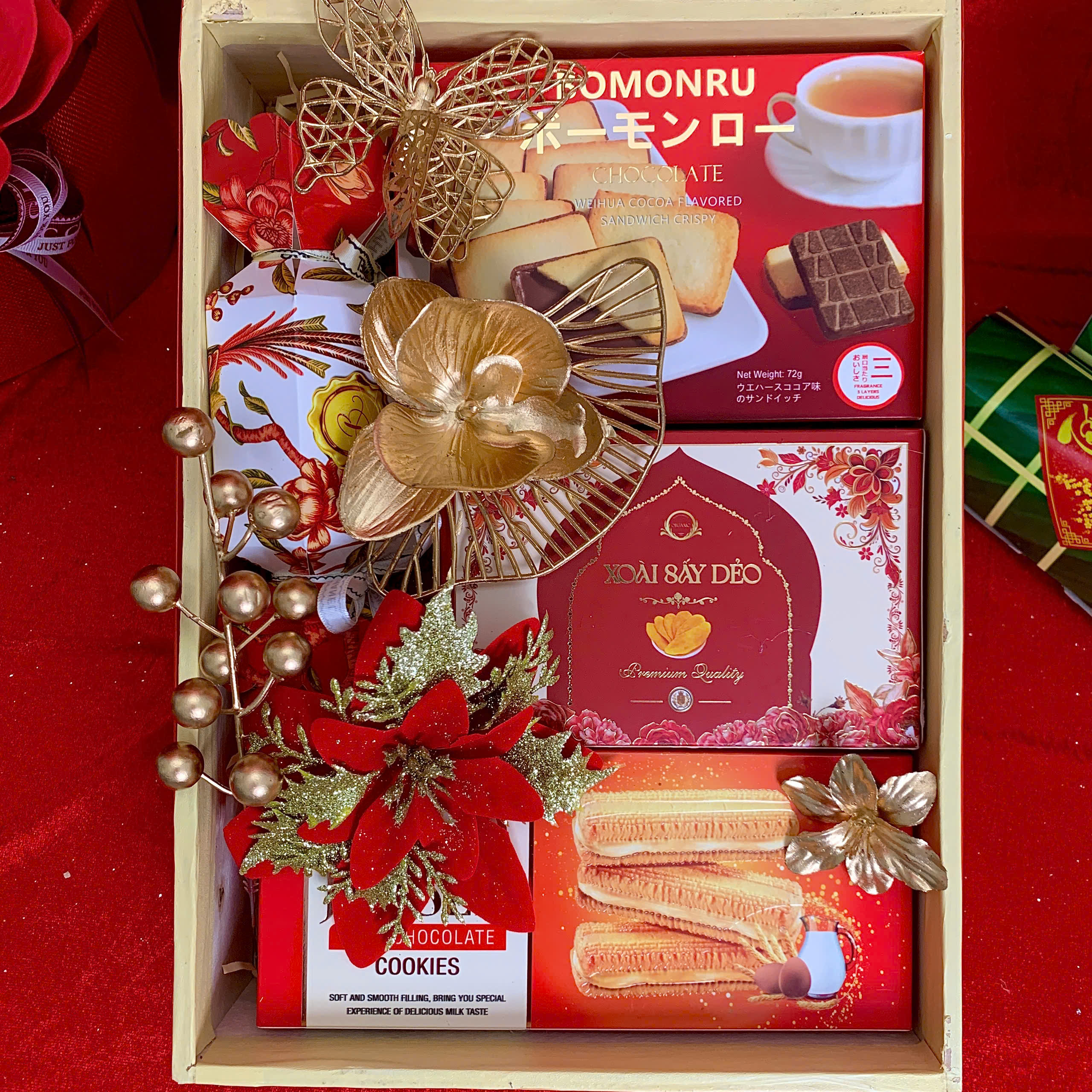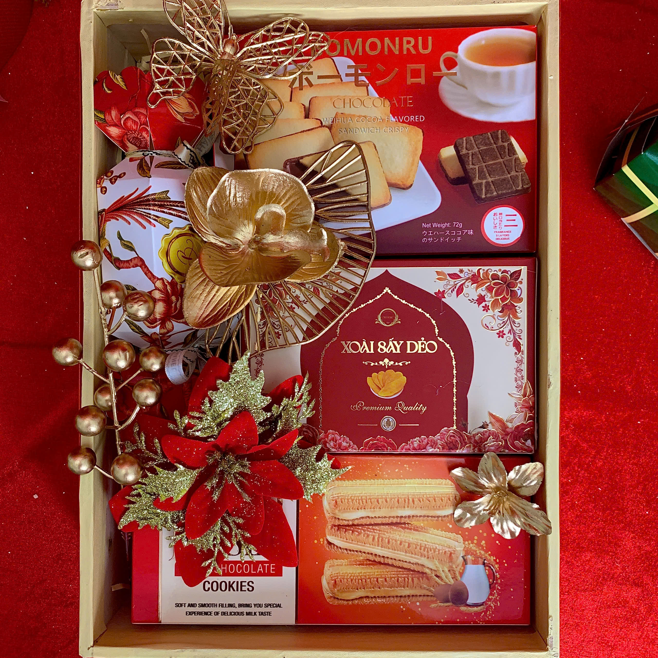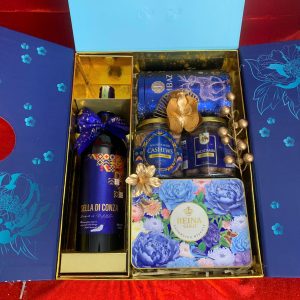 - Thiết kế sang trọng: Hộp quà phối tông đỏ – vàng – xanh dương, tượng trưng cho may mắn, tài lộc và thịnh vượng.