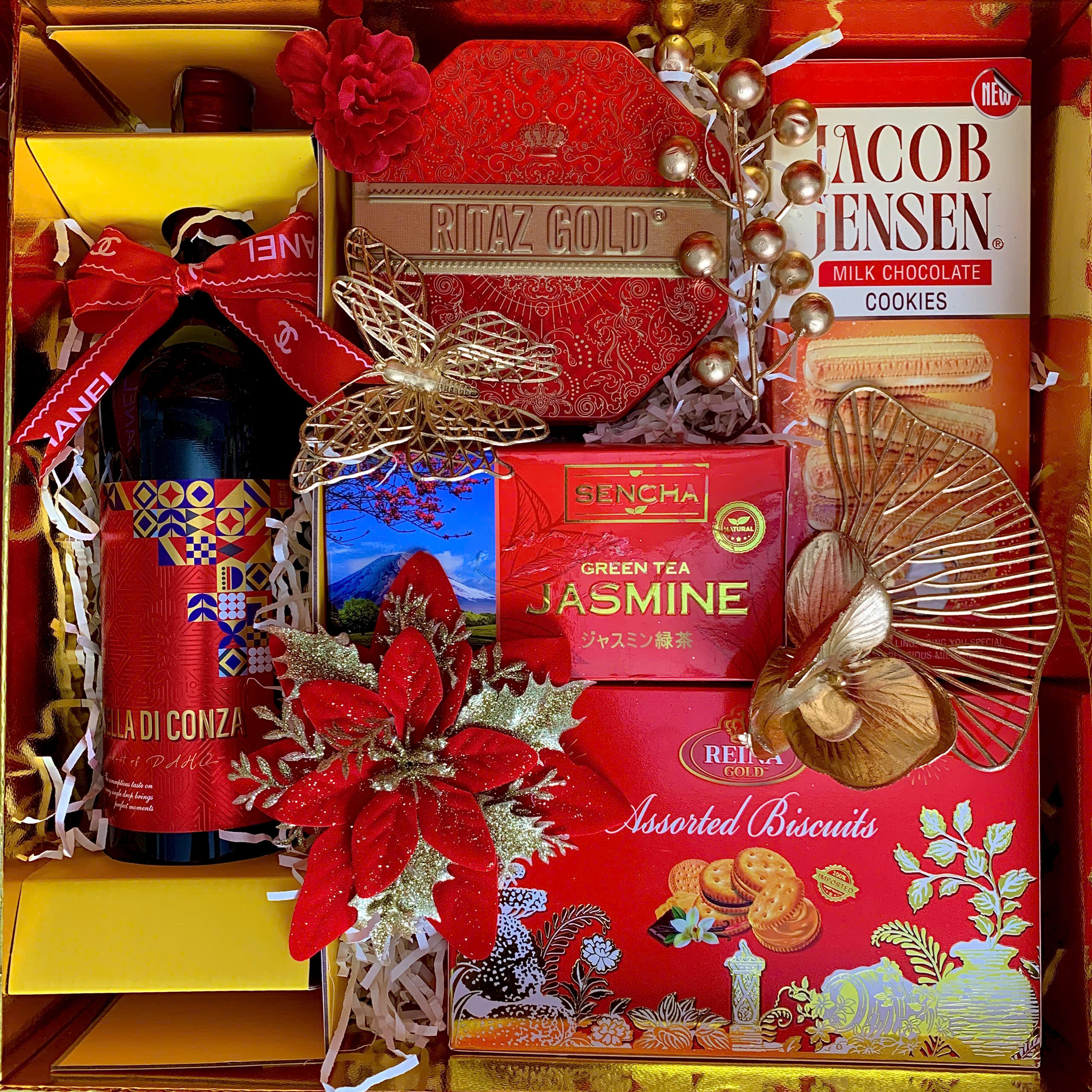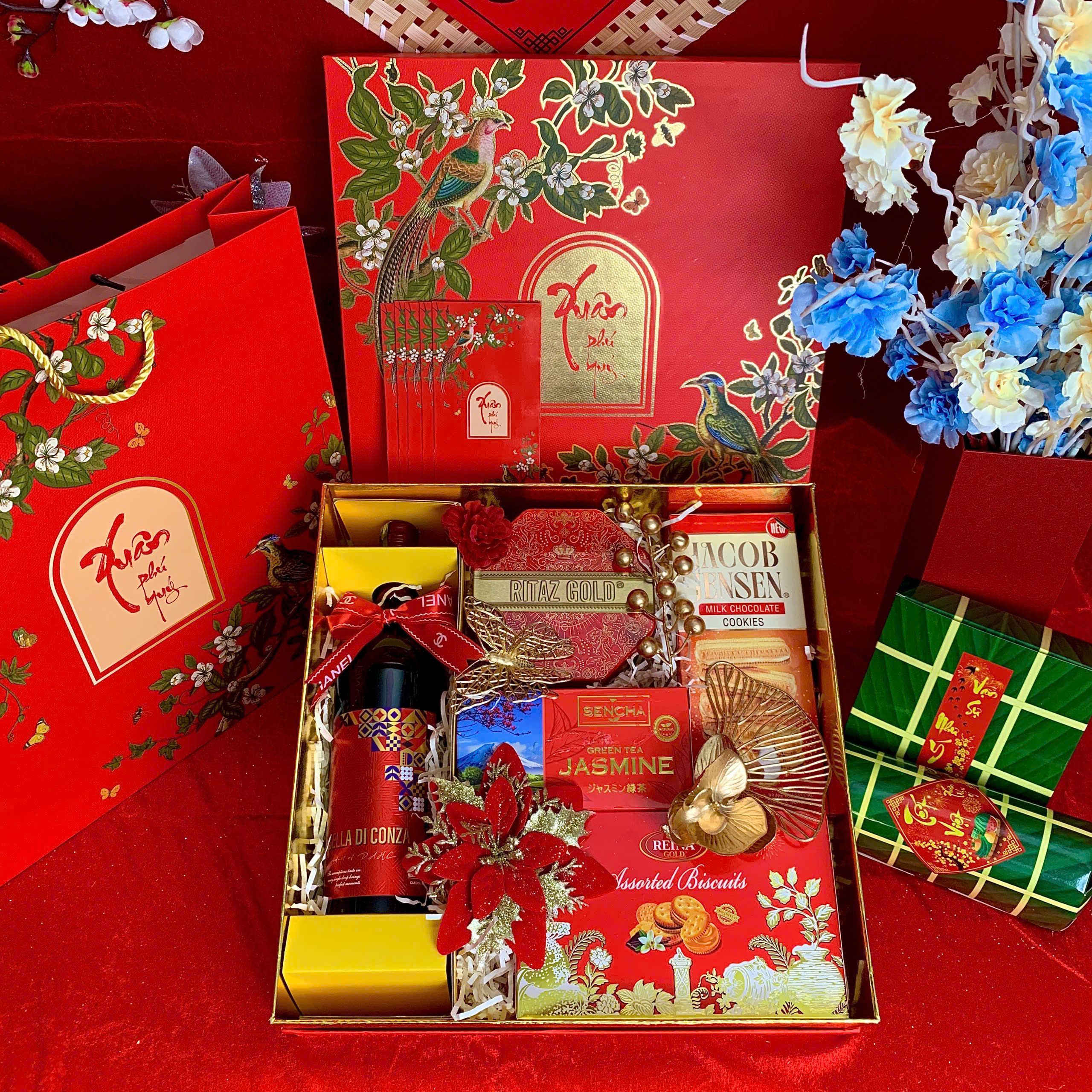 - Thiết kế sang trọng: Hộp quà phối tông đỏ – vàng – xanh dương, tượng trưng cho may mắn, tài lộc và thịnh vượng.