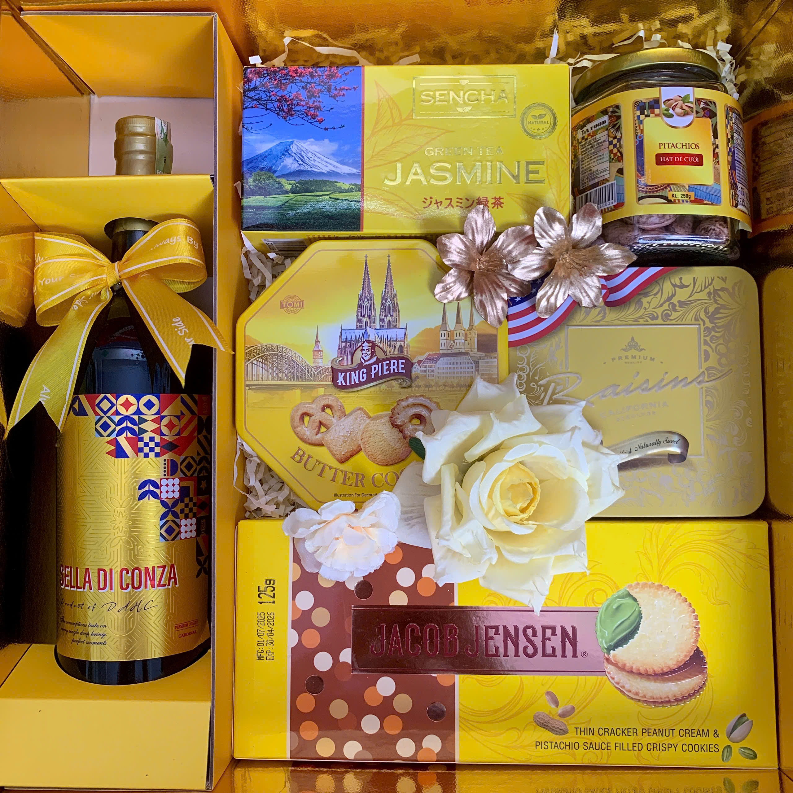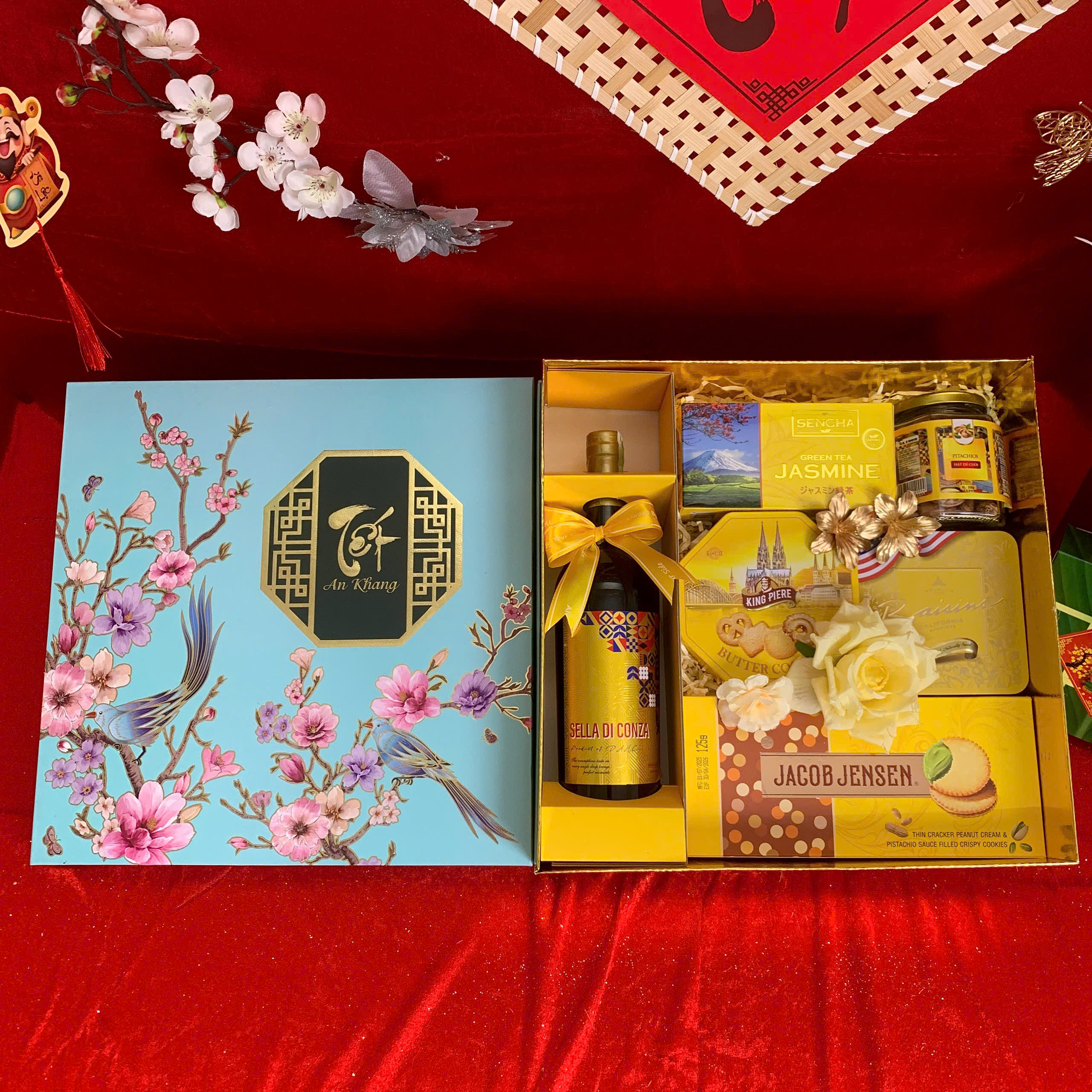 - Thiết kế sang trọng: Hộp quà phối tông đỏ – vàng – xanh dương, tượng trưng cho may mắn, tài lộc và thịnh vượng.