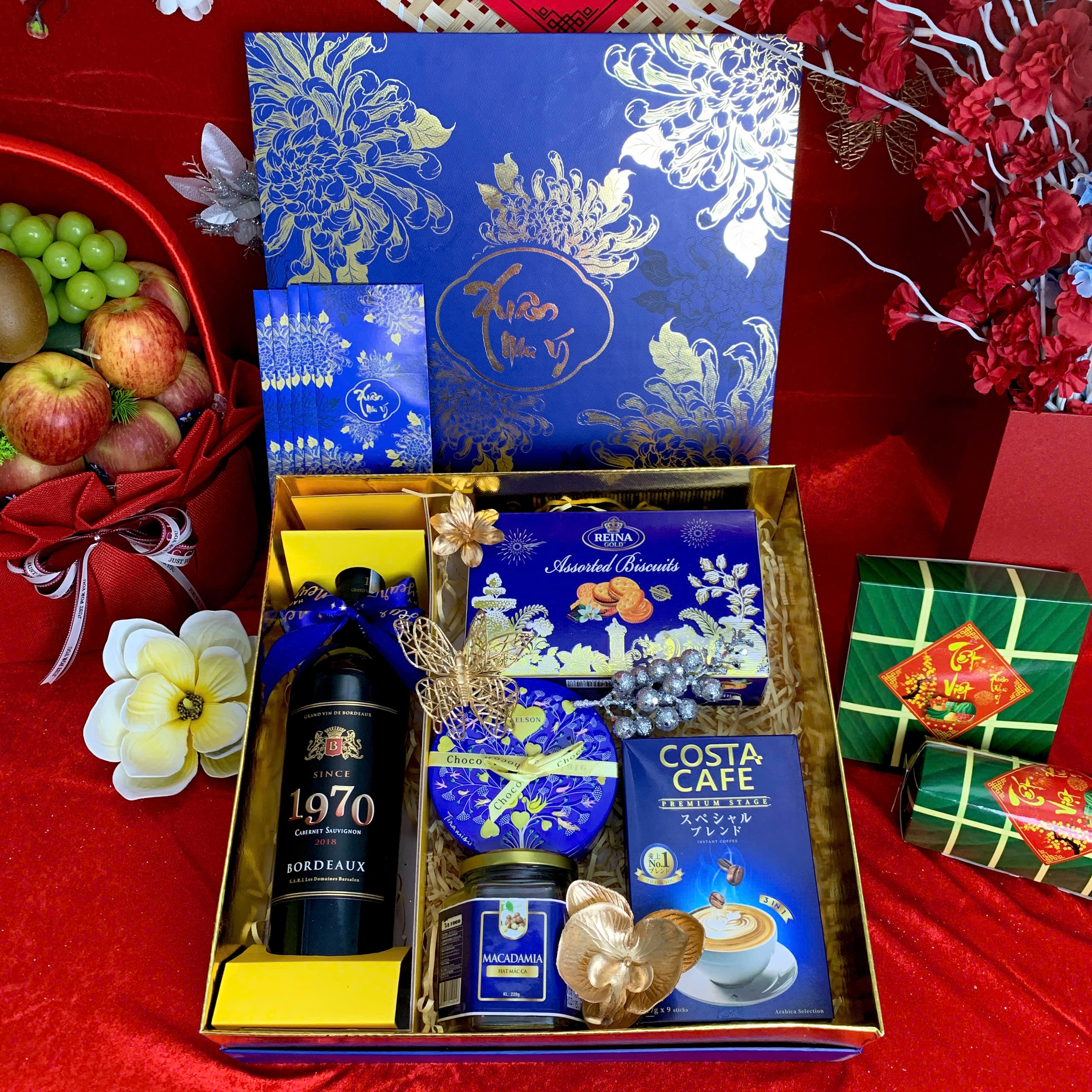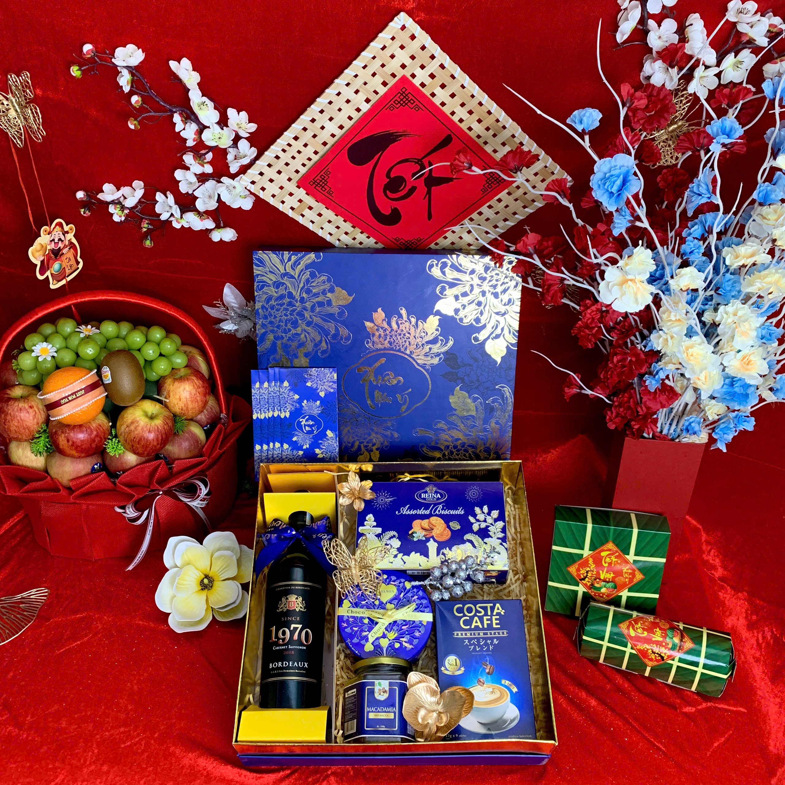 - Thiết kế sang trọng: Hộp quà phối tông đỏ – vàng – xanh dương, tượng trưng cho may mắn, tài lộc và thịnh vượng.