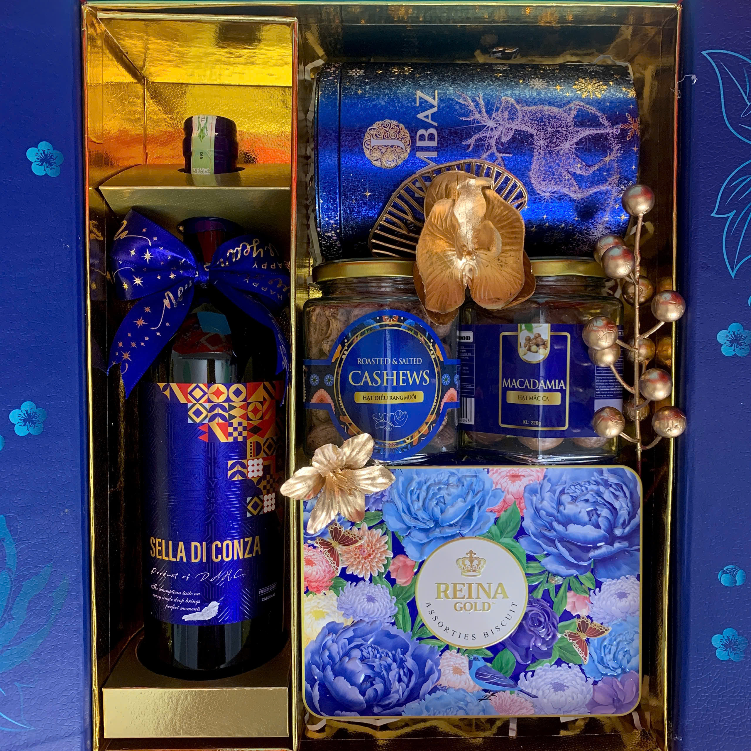 - Thiết kế sang trọng: Hộp quà phối tông đỏ – vàng – xanh dương, tượng trưng cho may mắn, tài lộc và thịnh vượng.