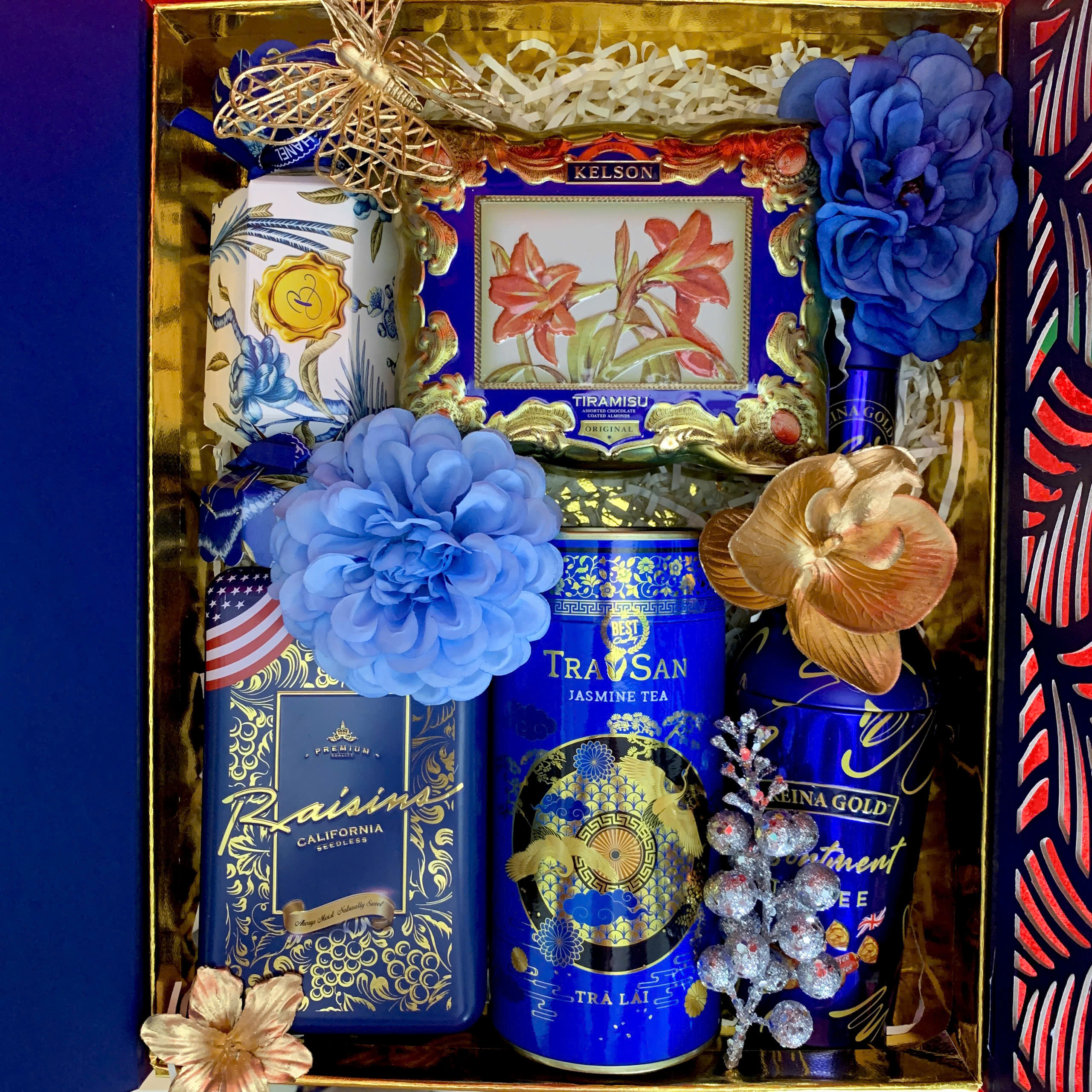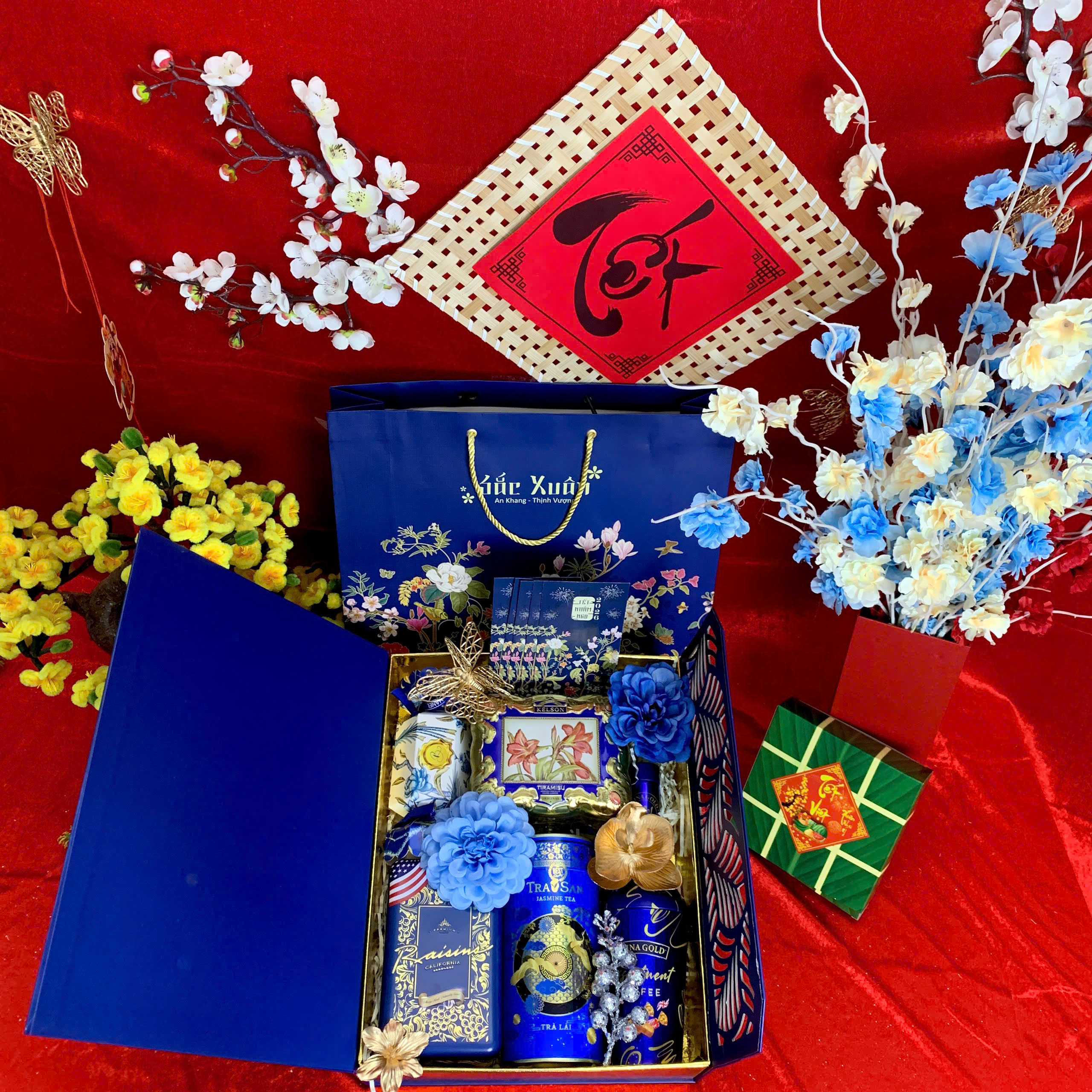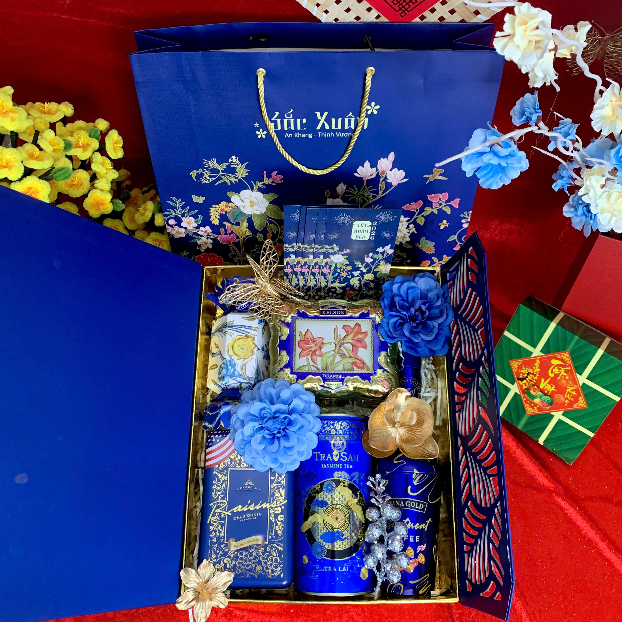 - Thiết kế sang trọng: Hộp quà phối tông đỏ – vàng – xanh dương, tượng trưng cho may mắn, tài lộc và thịnh vượng.