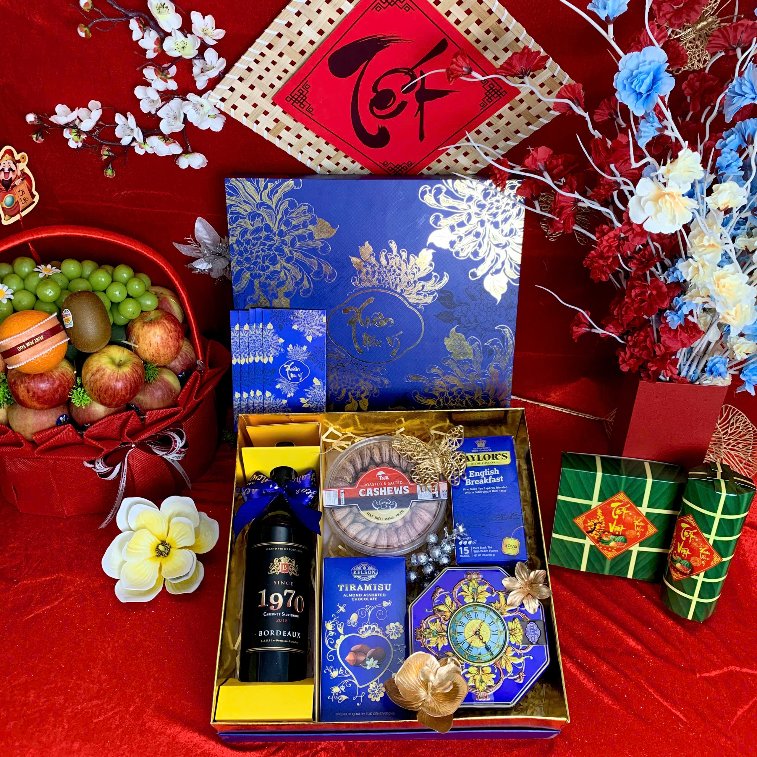 - Thiết kế sang trọng: Hộp quà phối tông đỏ – vàng – xanh dương, tượng trưng cho may mắn, tài lộc và thịnh vượng.