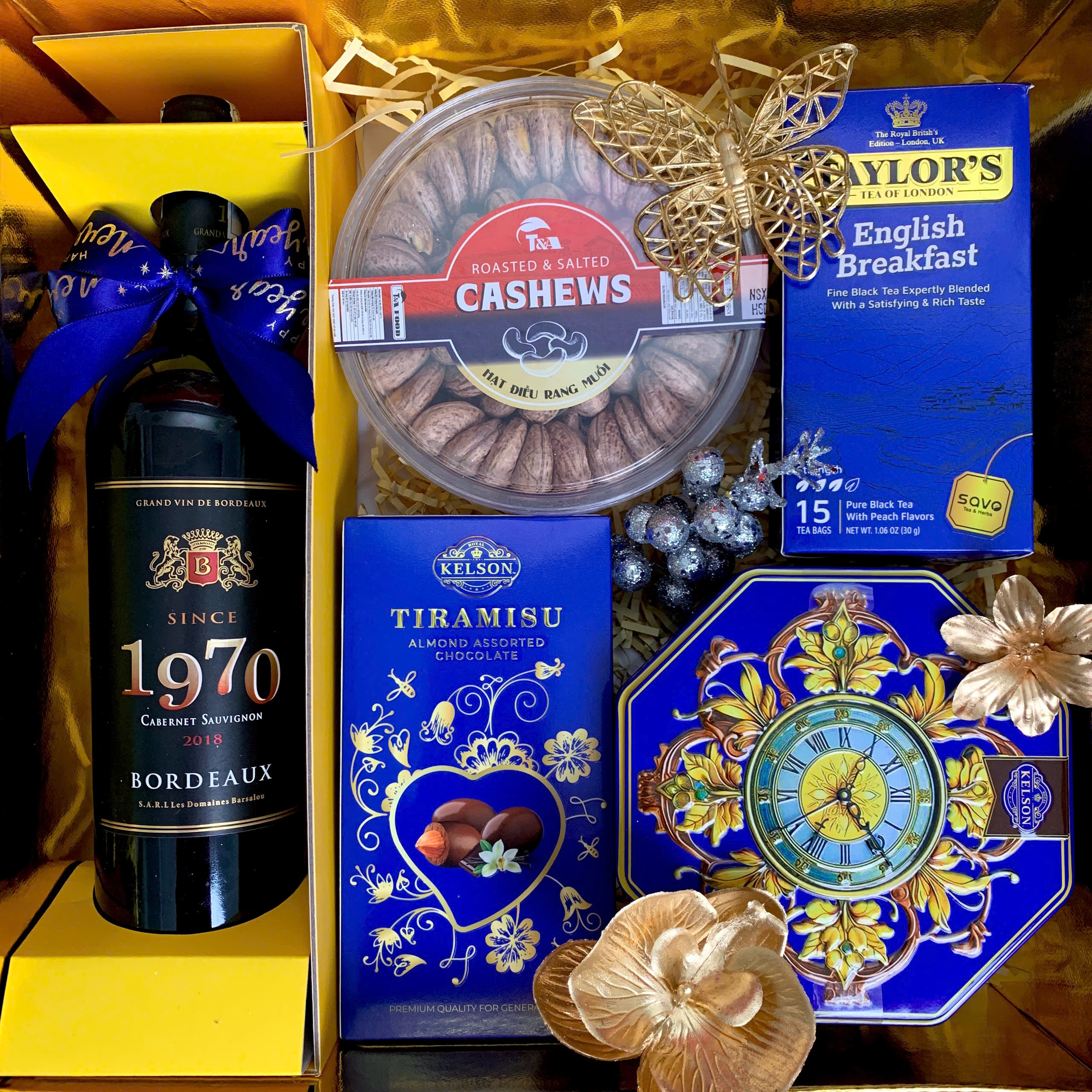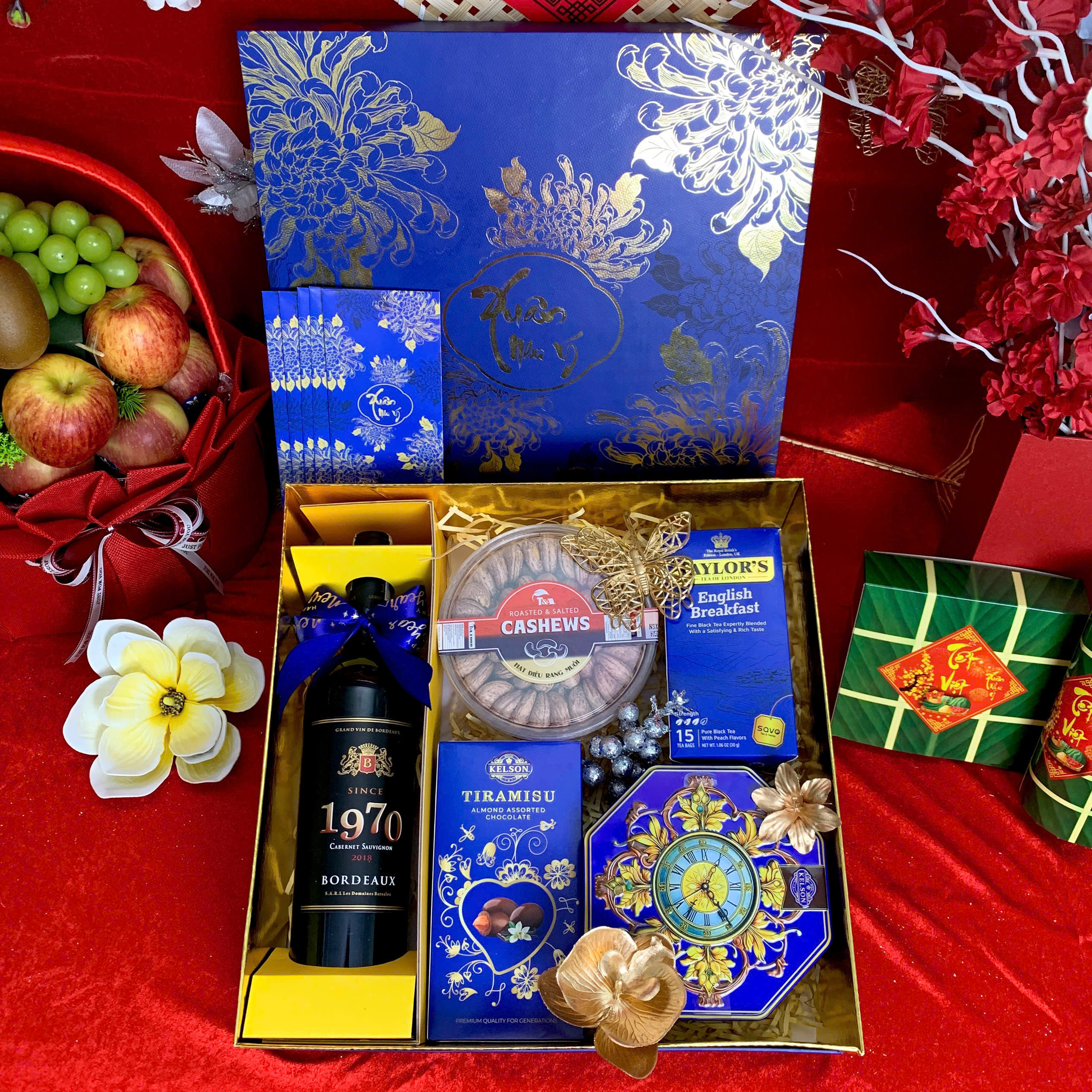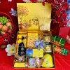 - Thiết kế sang trọng: Hộp quà phối tông đỏ – vàng – xanh dương, tượng trưng cho may mắn, tài lộc và thịnh vượng.