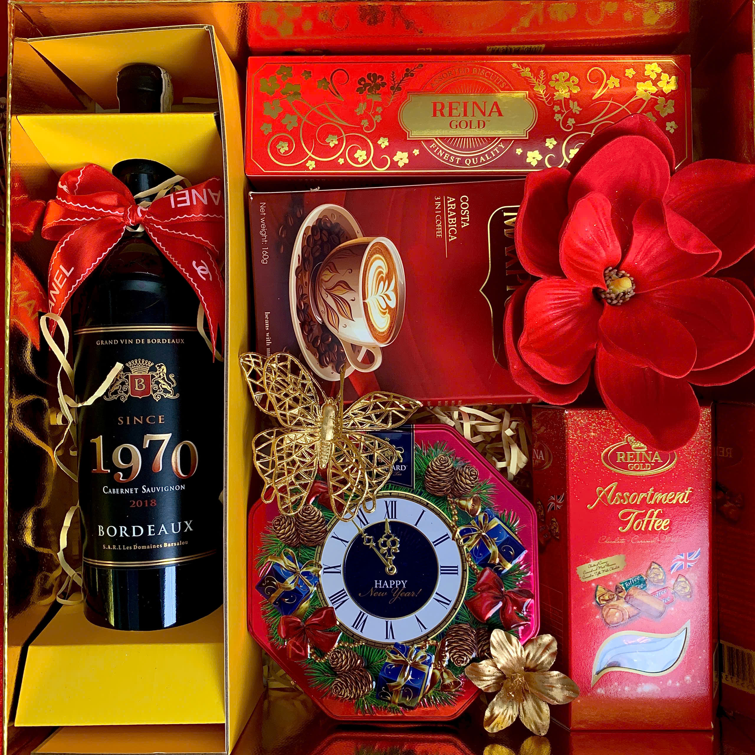 STT Tên sản phẩm Xuất xứ 1 Rượu 1970 Pháp 2 Bánh Reina ống giấy CN 90g x 36 Thái Lan 3 Cà phê hòa tan Costa 3in1 kiểu Nhật 153g x 36 ĐỎ Việt Nam 4 Socola Tiramisu kelson thập cẩm BGĐHỒ 110g x 24 Malaysia 5 Kẹo Toffee reina HG VÁT 110g x 36 Malaysia 6 Trà Richard Đồng Hồ 80g x 10 Nga 7 Hộp Quà + Túi Giấy + Bao lì xì + Phụ kiện Hưng Việt Phát 8 In Logo Hộp Quà + Công Gói Hưng Việt Phát