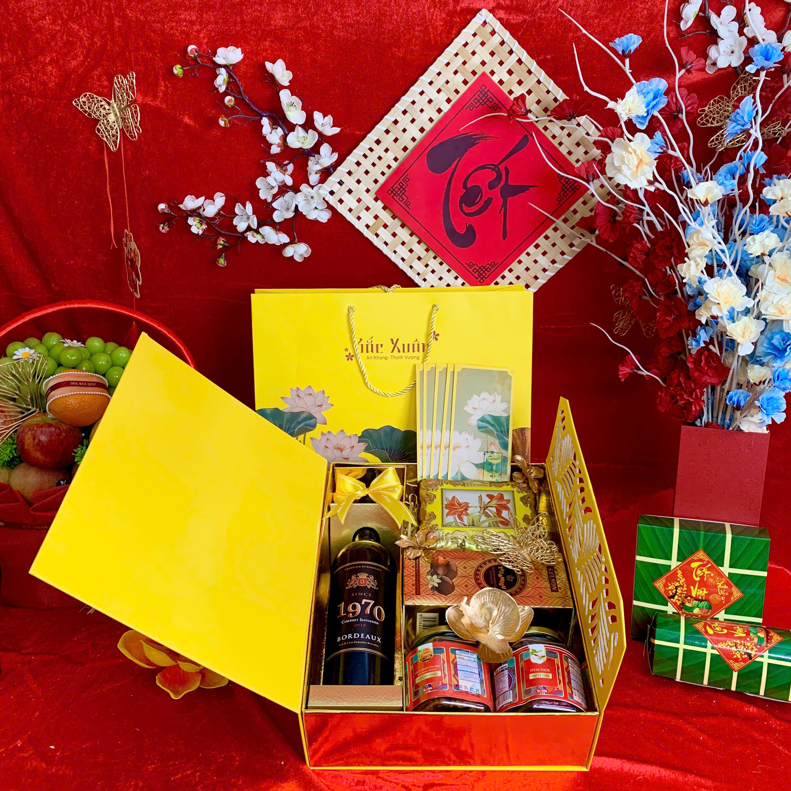 - Thiết kế sang trọng: Hộp quà phối tông đỏ – vàng – xanh dương, tượng trưng cho may mắn, tài lộc và thịnh vượng.