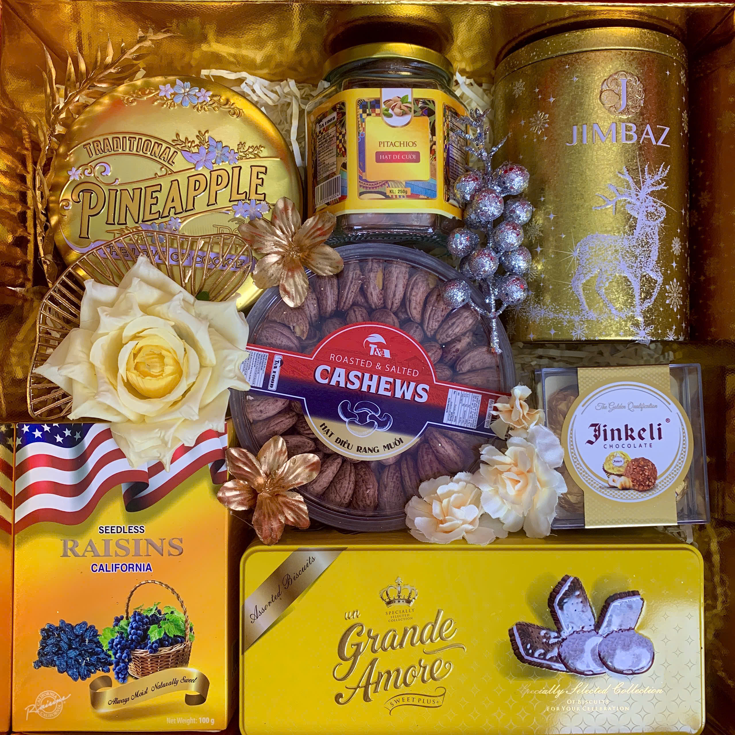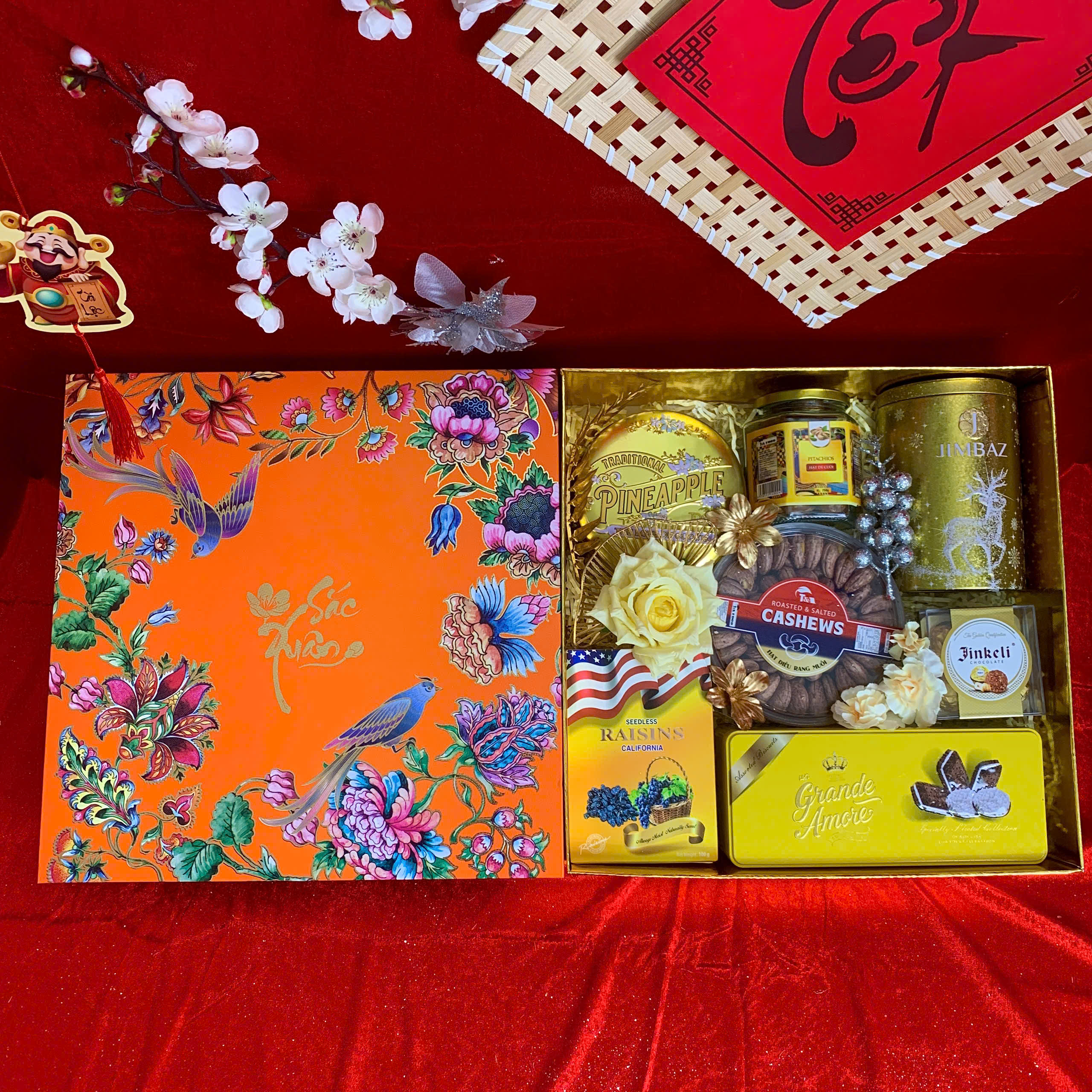 - Thiết kế sang trọng: Hộp quà phối tông đỏ – vàng – xanh dương, tượng trưng cho may mắn, tài lộc và thịnh vượng.