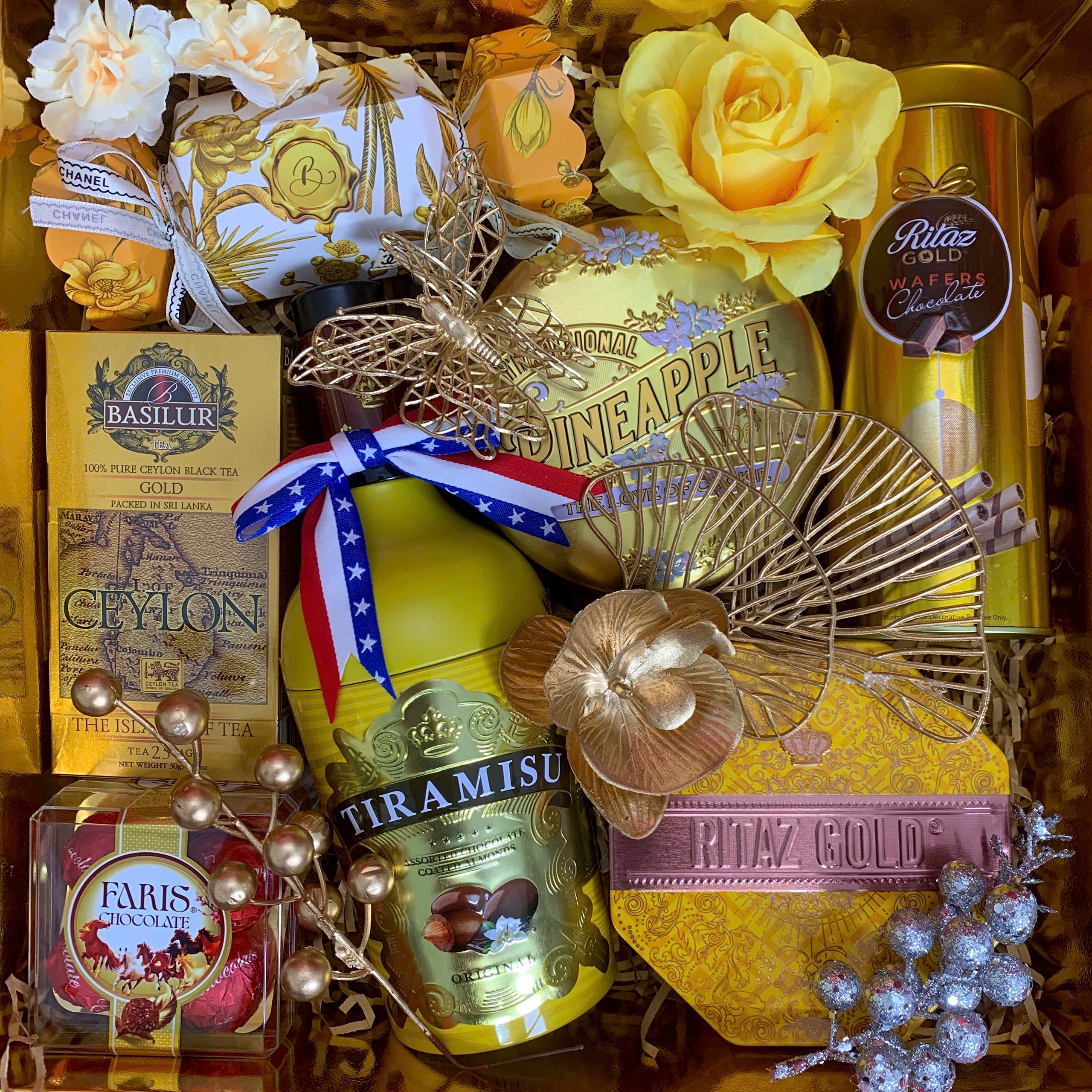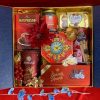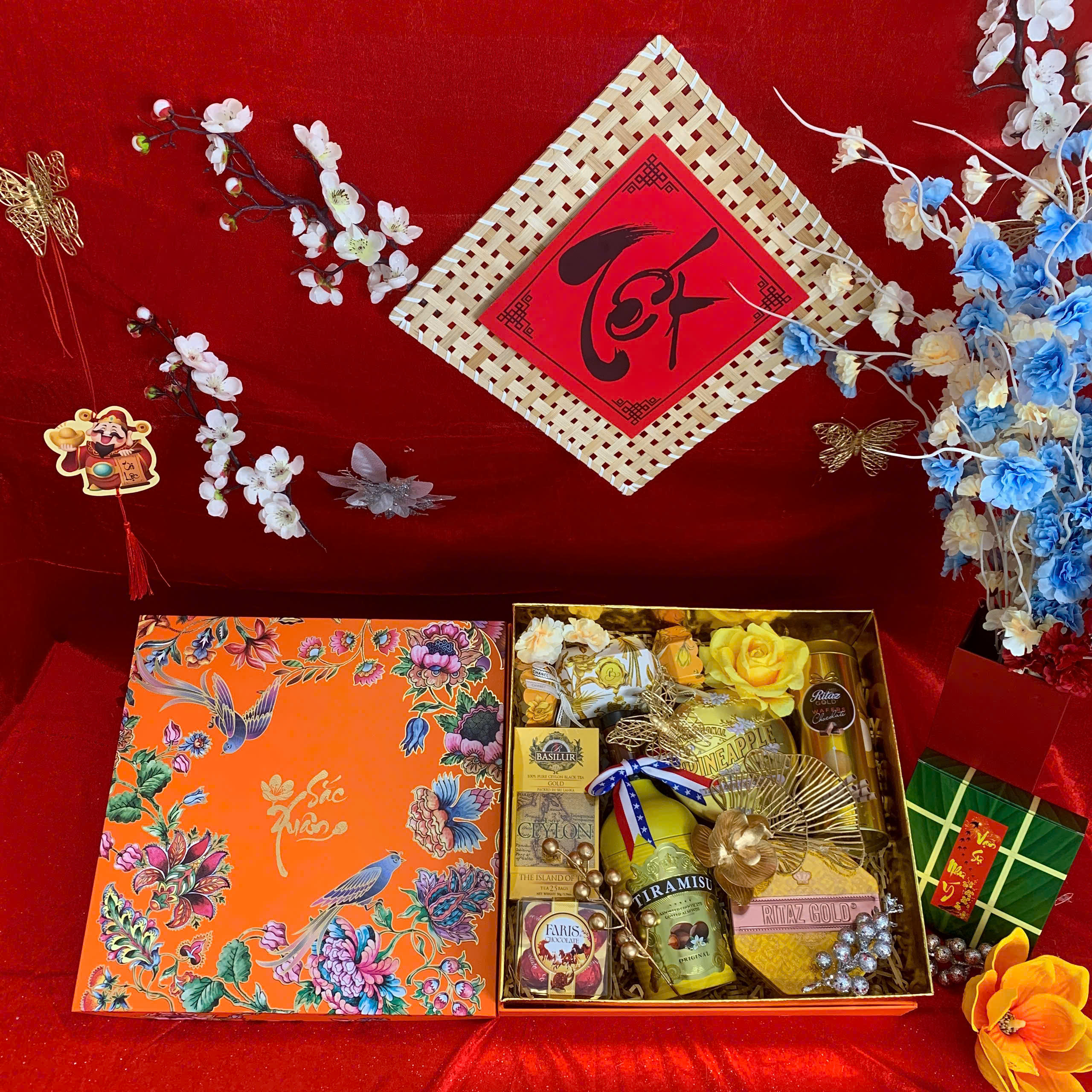 - Thiết kế sang trọng: Hộp quà phối tông đỏ – vàng – xanh dương, tượng trưng cho may mắn, tài lộc và thịnh vượng.