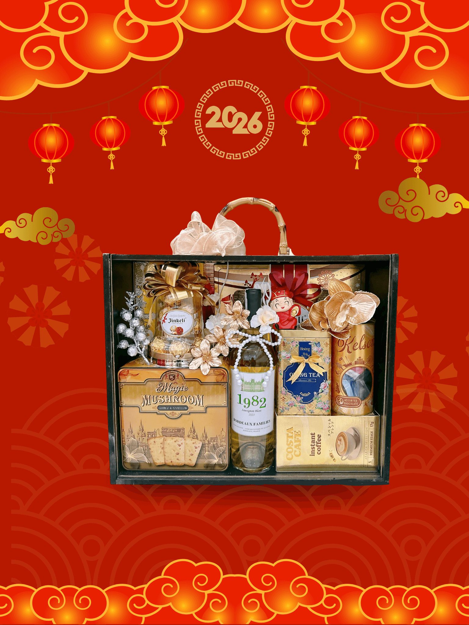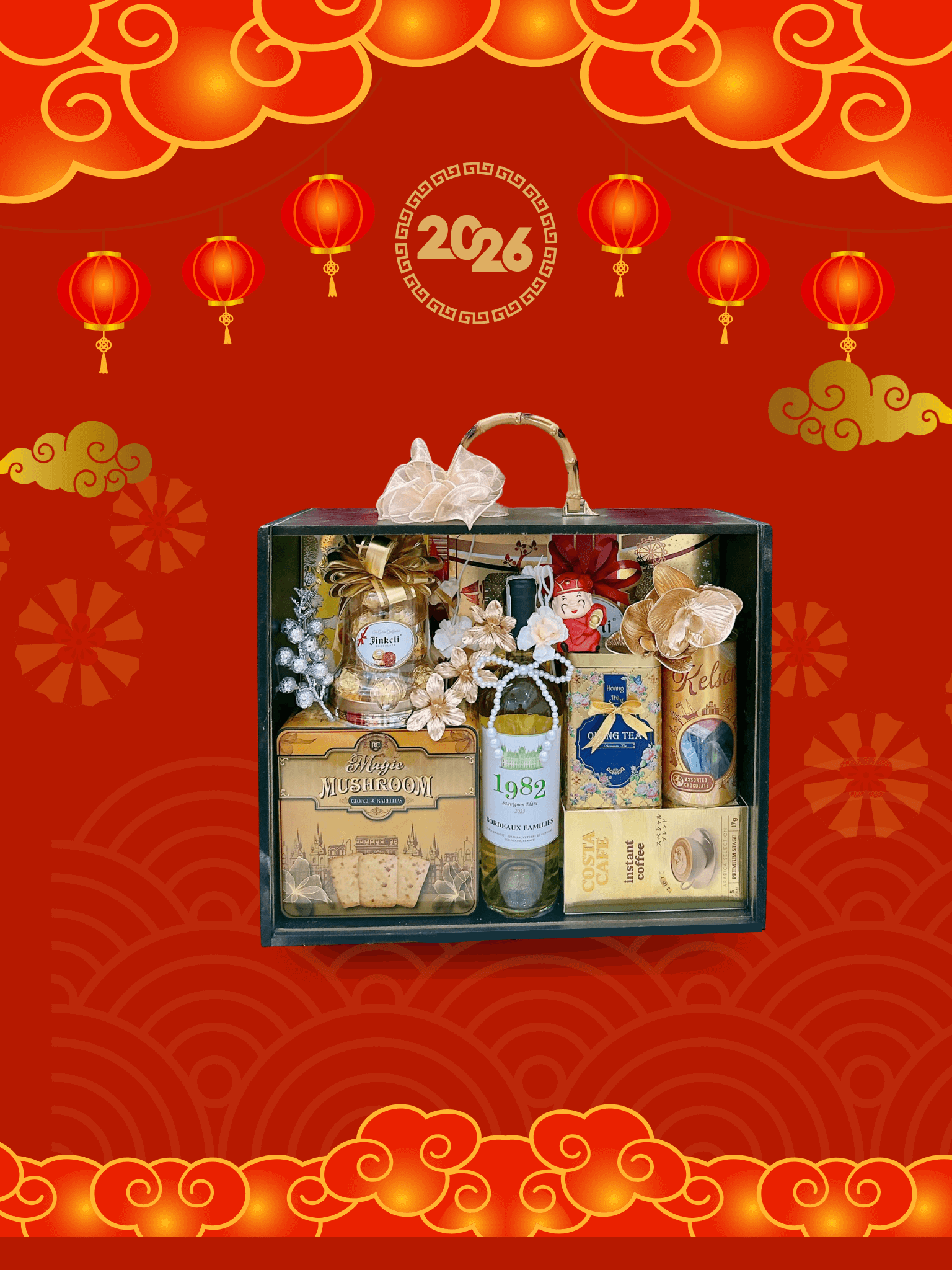 - Thiết kế sang trọng: Hộp quà phối tông đỏ – vàng – xanh dương, tượng trưng cho may mắn, tài lộc và thịnh vượng.