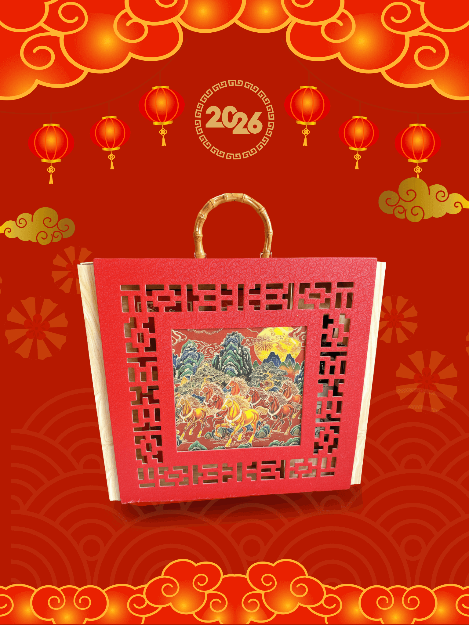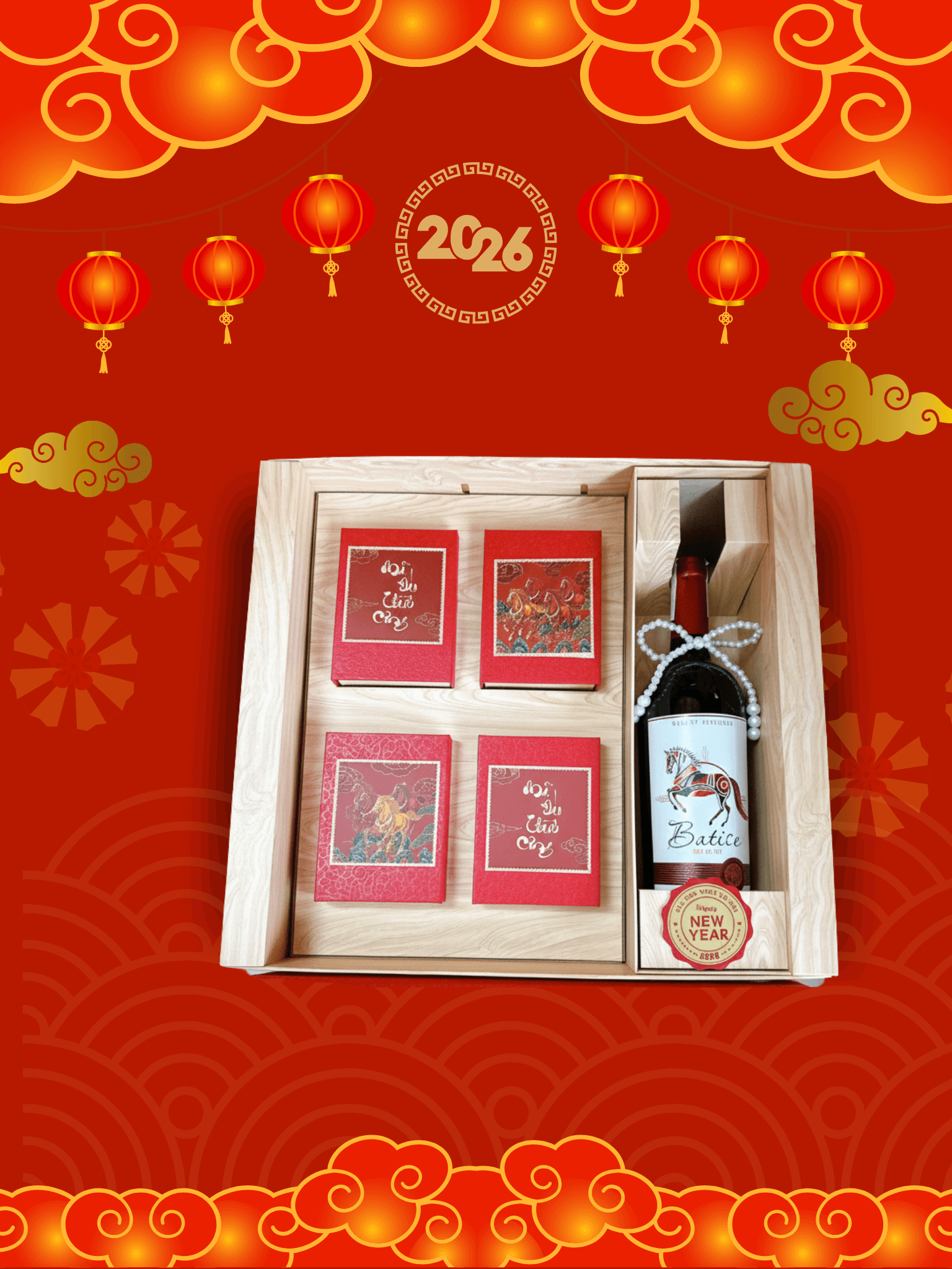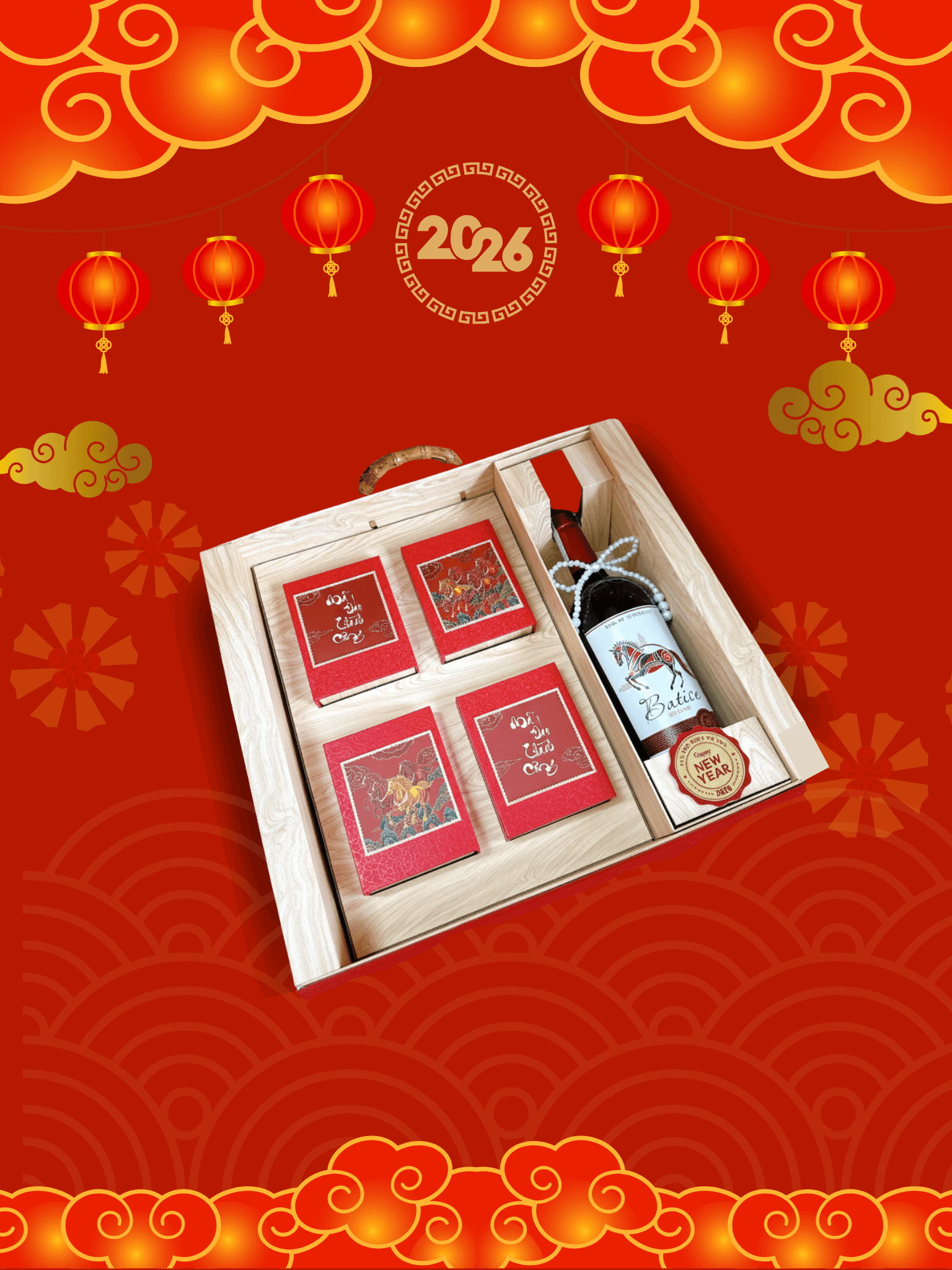 - Thiết kế sang trọng: Hộp quà phối tông đỏ – vàng – xanh dương, tượng trưng cho may mắn, tài lộc và thịnh vượng.