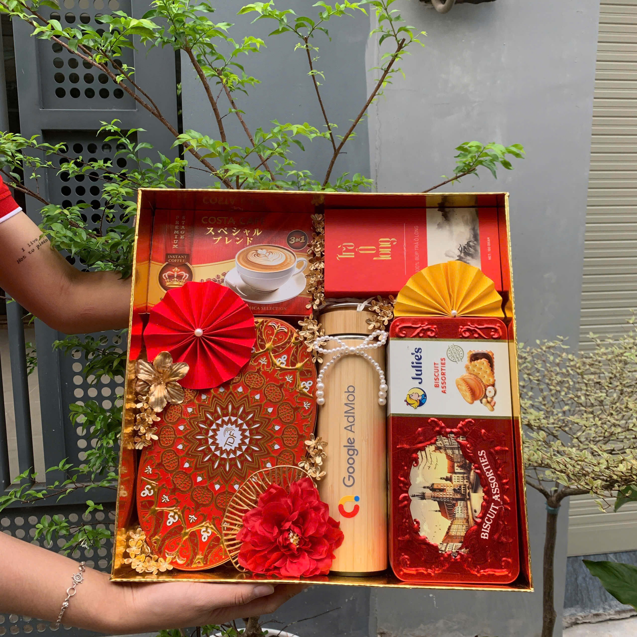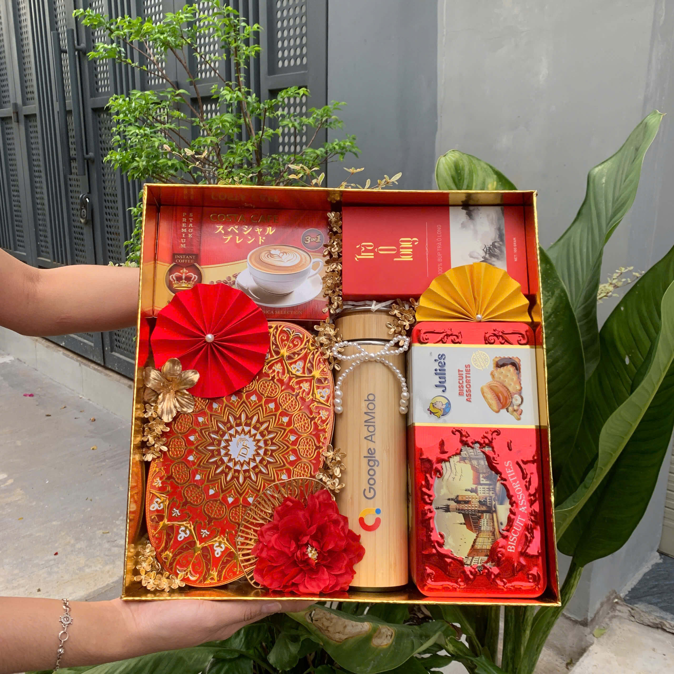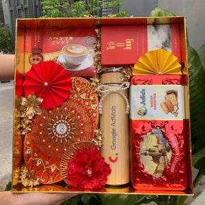 - Thiết kế sang trọng: Hộp quà phối tông đỏ – vàng – xanh dương, tượng trưng cho may mắn, tài lộc và thịnh vượng.