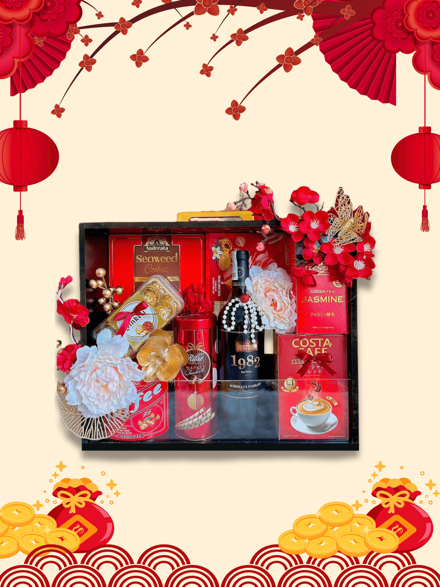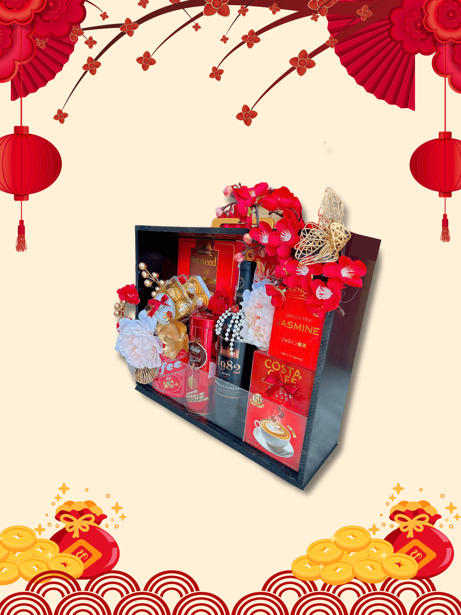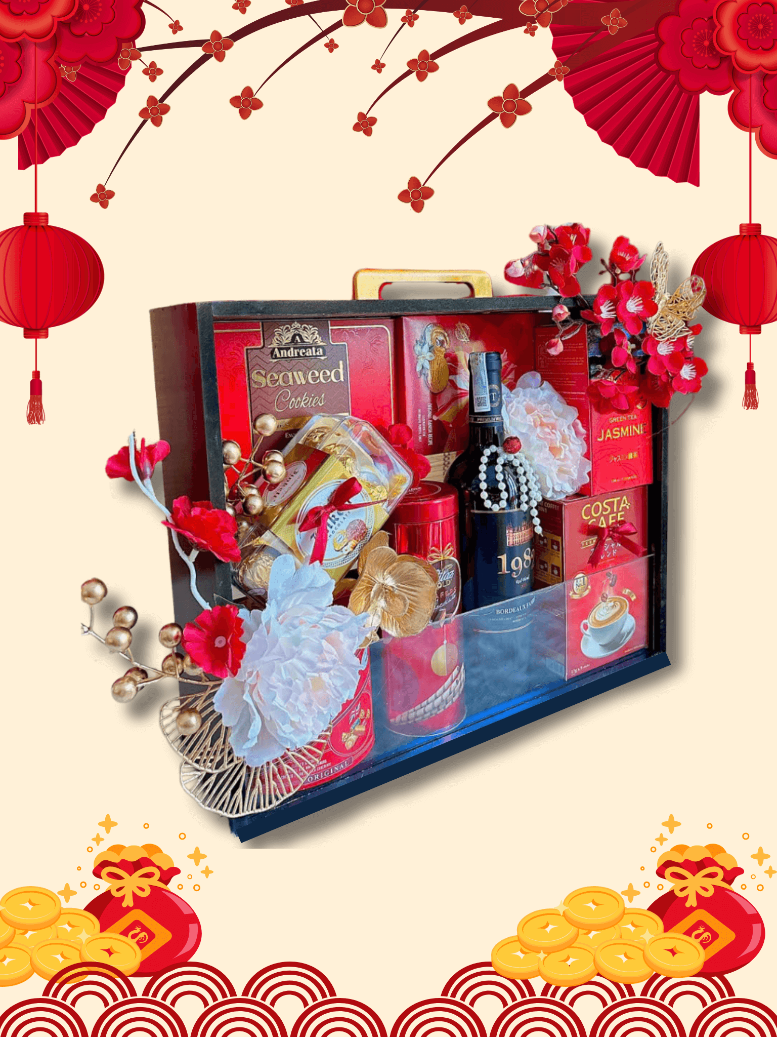 - Thiết kế sang trọng: Hộp quà phối tông đỏ – vàng – xanh dương, tượng trưng cho may mắn, tài lộc và thịnh vượng.
