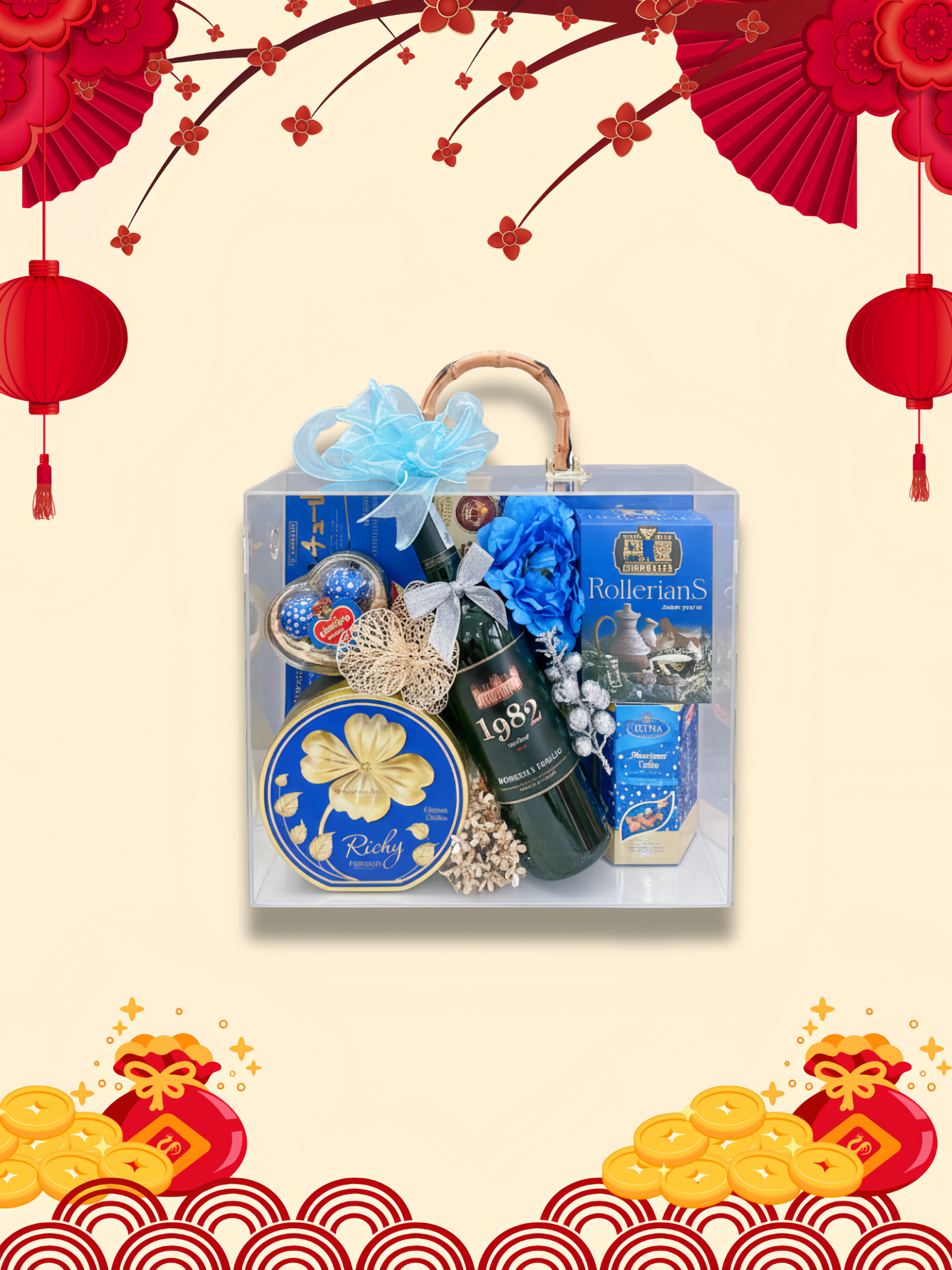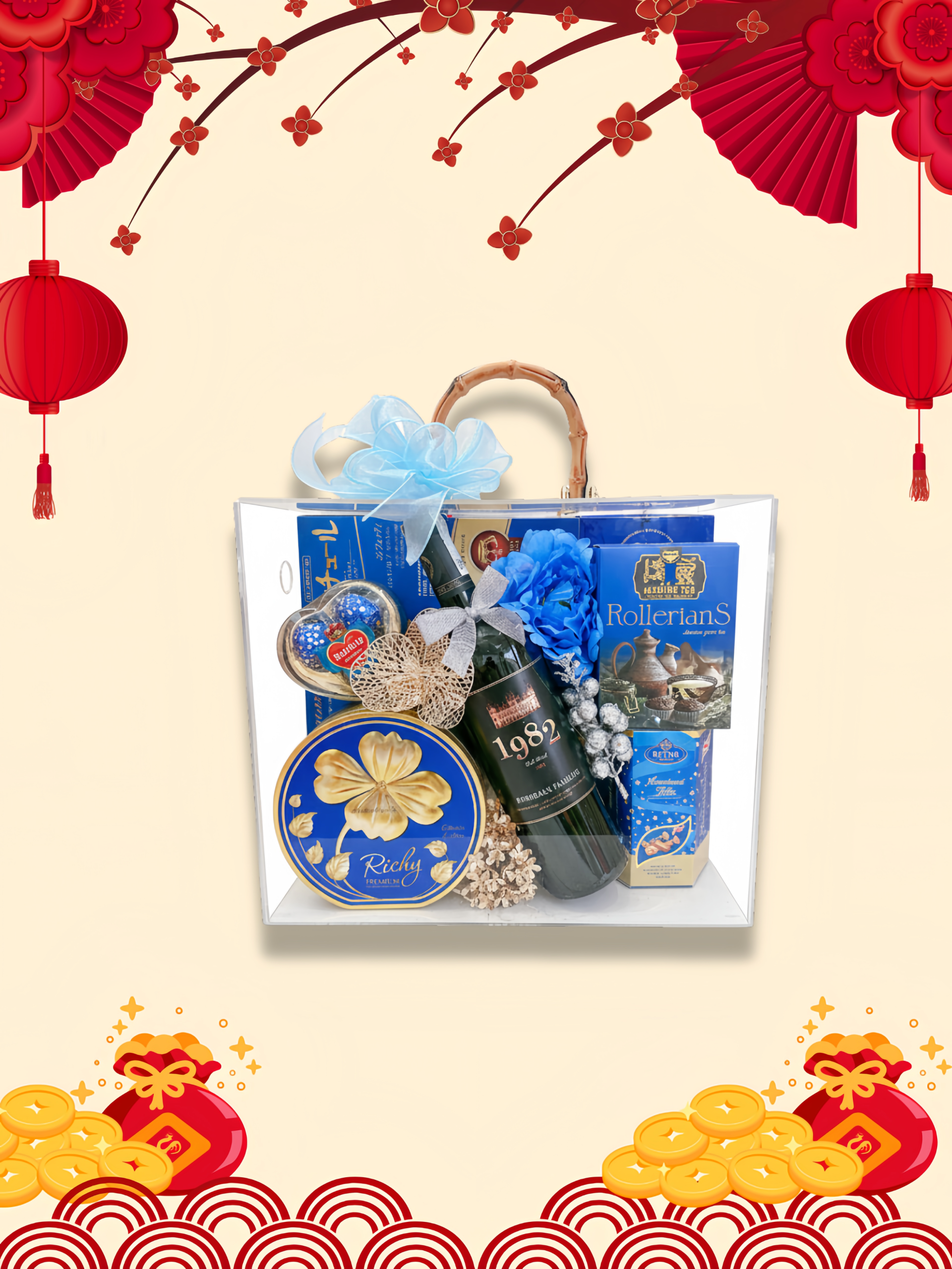- Thiết kế sang trọng: Hộp quà phối tông đỏ – vàng – xanh dương, tượng trưng cho may mắn, tài lộc và thịnh vượng.