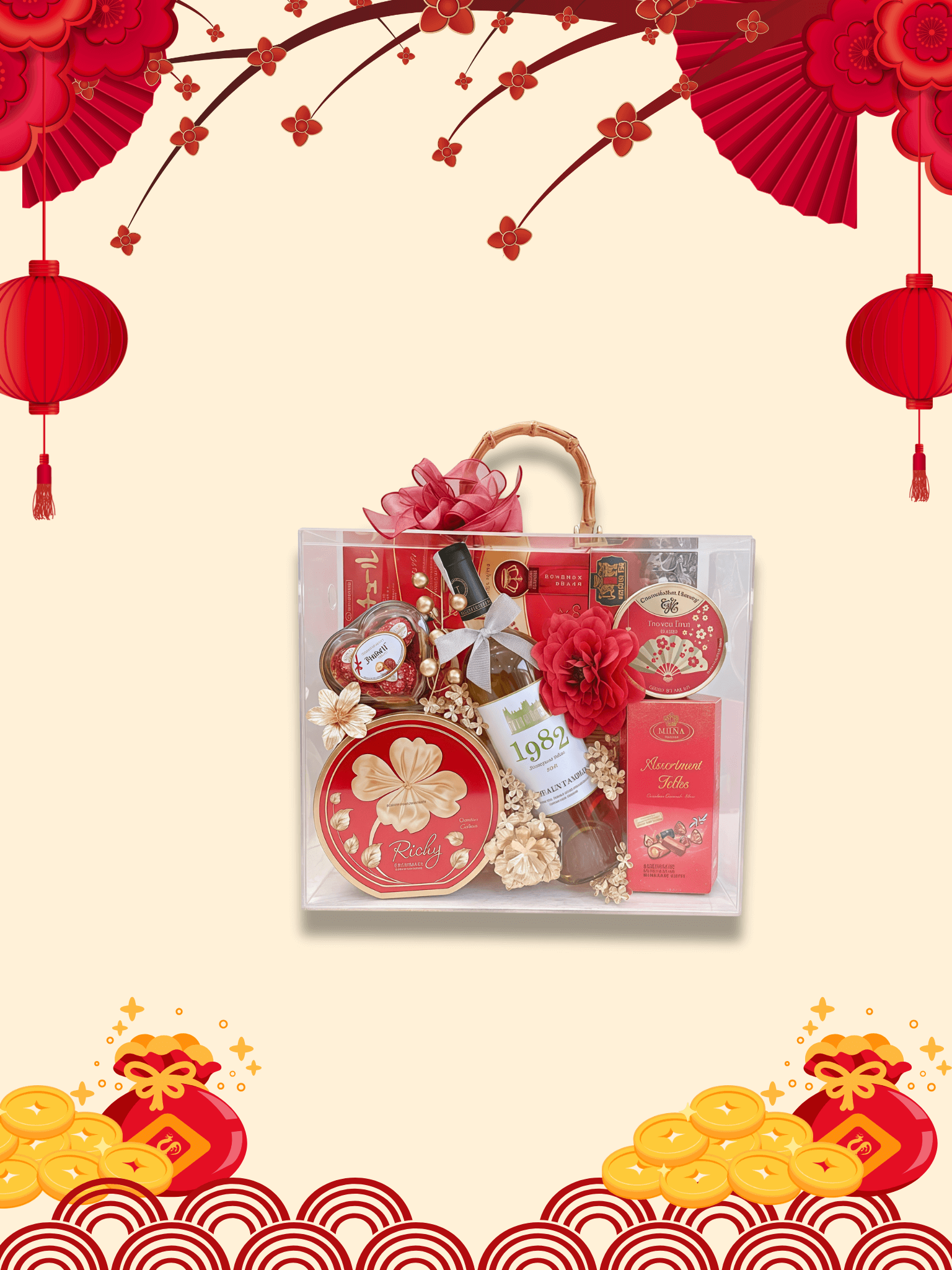 - Thiết kế sang trọng: Hộp quà phối tông đỏ – vàng – xanh dương, tượng trưng cho may mắn, tài lộc và thịnh vượng.